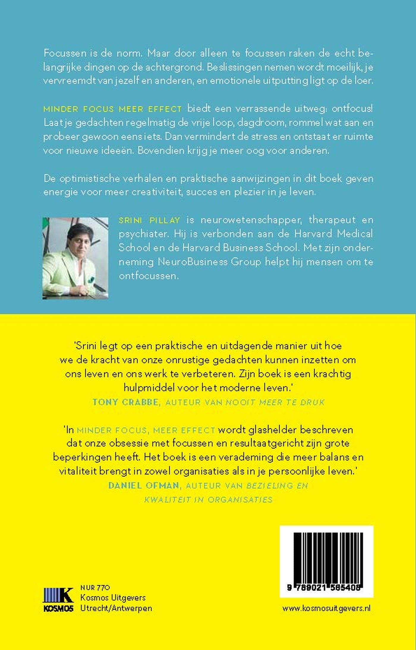 ‘Minder focus, meer effect’ van Srini Pillay is het tegengeluid over focus en discipline. Focus is de norm. Maar door alleen te focussen raken de echt belangrijke dingen op de achtergrond. Beslissingen nemen wordt moeilijk, je vervreemdt van jezelf en anderen, en emotionele uitputting ligt op de loer.