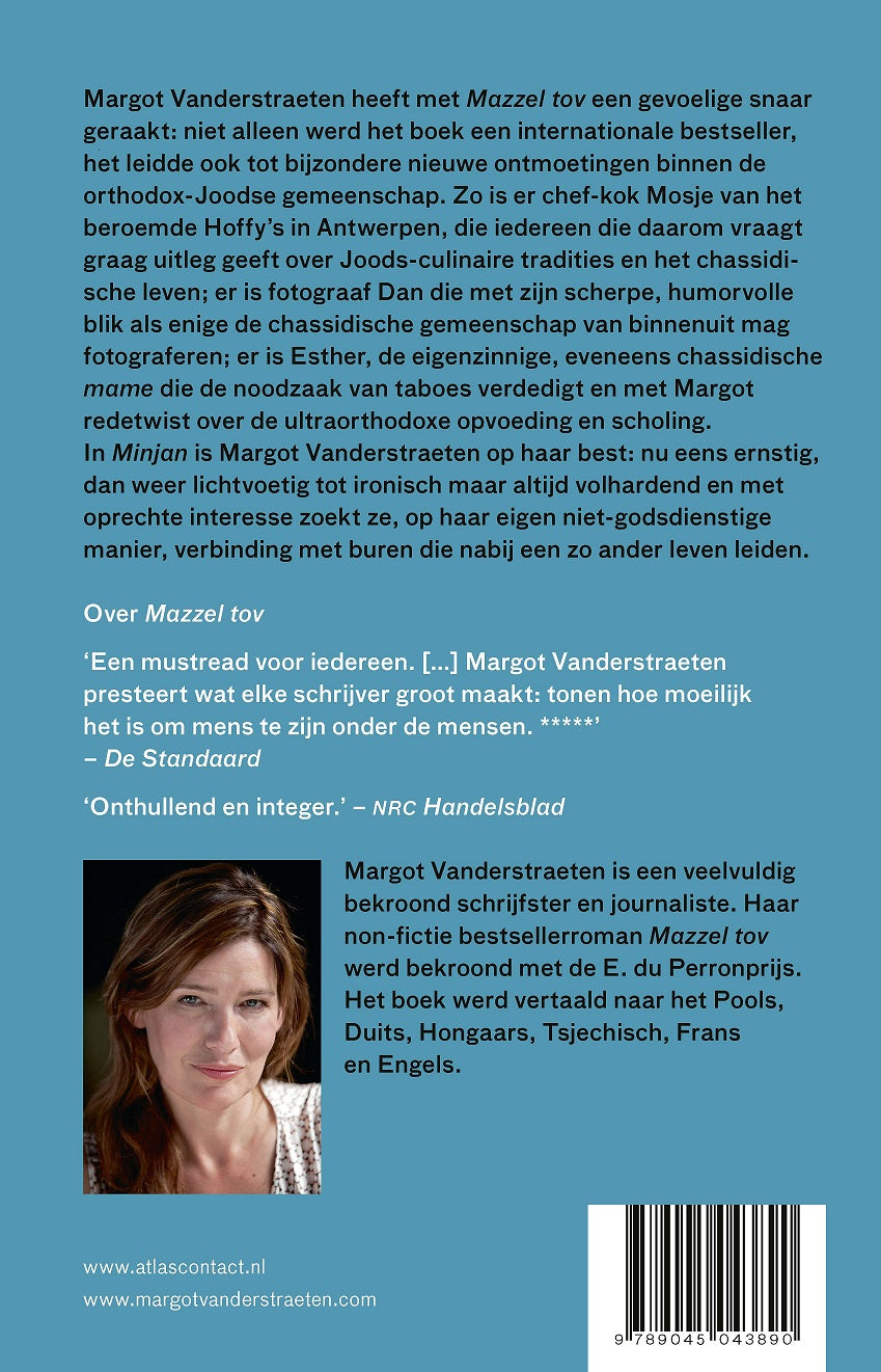 In Minjan is Margot Vanderstraeten op haar best: nu eens ernstig, dan weer lichtvoetig tot ironisch maar altijd met oprechte interesse zoekt zij, op haar eigen niet-godsdienstige manier, verbinding met buren die nabij een zo ander leven leiden.