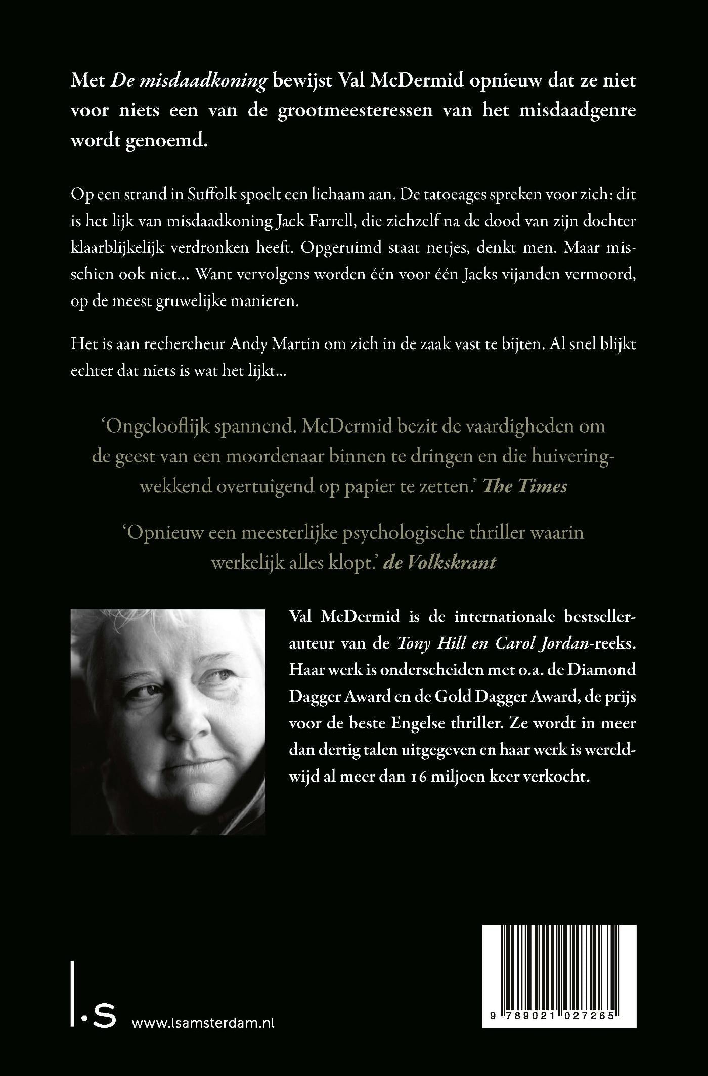 In Misdaadkoning van bestsellerauteur Val McDermid spoelt op een strand in Suffolk een lichaam aan. De tatoeages spreken voor zich: dit is het lijk van de misdaadkoning Jack Farrell, die zichzelf na de dood van zijn dochter klaarblijkelijk verdronken heeft. Opgeruimd staat netjes, denkt men. Maar misschien ook niet… Want vervolgens worden één voor één Jacks vijanden vermoord, op de meest gruwelijke manieren.