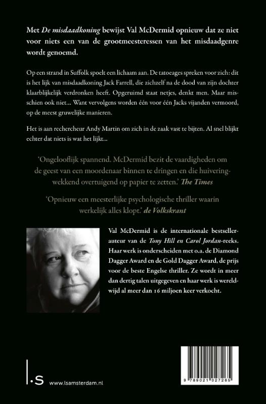 (POD)In Misdaadkoning van bestsellerauteur Val McDermid spoelt op een strand in Suffolk een lichaam aan. De tatoeages spreken voor zich: dit is het lijk van de misdaadkoning Jack Farrell, die zichzelf na de dood van zijn dochter klaarblijkelijk verdronken heeft. Opgeruimd staat netjes, denkt men. Maar misschien ook niet… Want vervolgens worden één voor één Jacks vijanden vermoord, op de meest gruwelijke manieren.