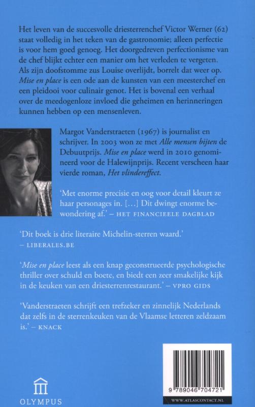 'Mise en place' is een ode aan de kunsten van een meesterchef en een pleidooi voor culinair genot. Het is bovenal een verhaal over de meedogenloze invloed die geheimen en herinneringen kunnen hebben op een mensenleven.