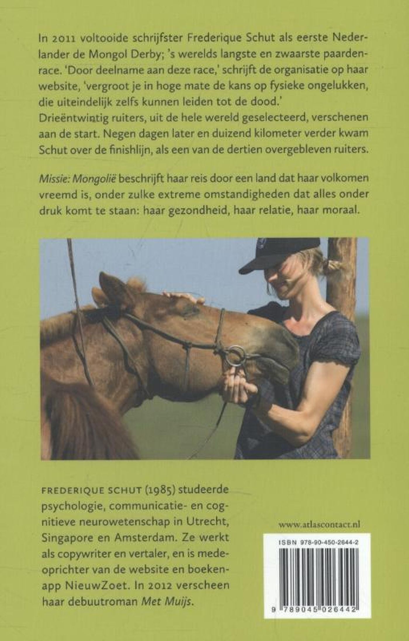 Drieëntwintig ruiters, uit de hele wereld geselecteerd, verschenen aan de start. Negen dagen later en duizend kilometer verder kwam Schut over de finishlijn, als een van de dertien overgebleven ruiters. Missie: Mongolië beschrijft haar reis door een land dat haar volkomen vreemd is, onder zulke extremen omstandigheden dat alles onder druk komt te staan: haar gezondheid, haar relatie, haar moraal.