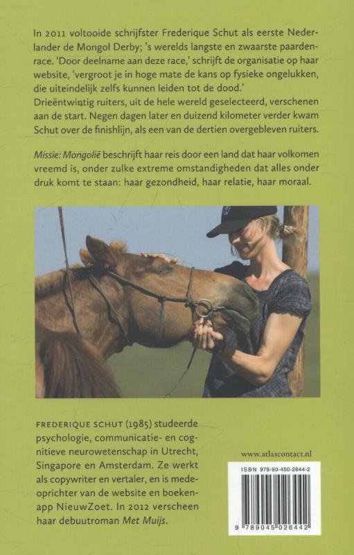 In 2011 voltooide Frederique Schut als eerste Nederlander de Mongol Derby; 's werelds langste en zwaarste paardenrace. 'Door deelname aan deze race,' schrijft de organisatie op haar website, 'vergroot je in hoge mate de kans op fysieke ongelukken, die uiteindelijk zelfs kunnen leiden tot de dood.' Drieëntwintig ruiters, uit de hele wereld geselecteerd, verschenen aan de start. Negen dagen later en duizend kilometer verder kwam Schut over de finishlijn, als een van de dertien overgebleven ruiters. Missie: Mongolië beschrijft haar reis door een land dat haar volkomen vreemd is, onder zulke extremen omstandigheden dat alles onder druk komt te staan: haar gezondheid, haar relatie, haar moraal.