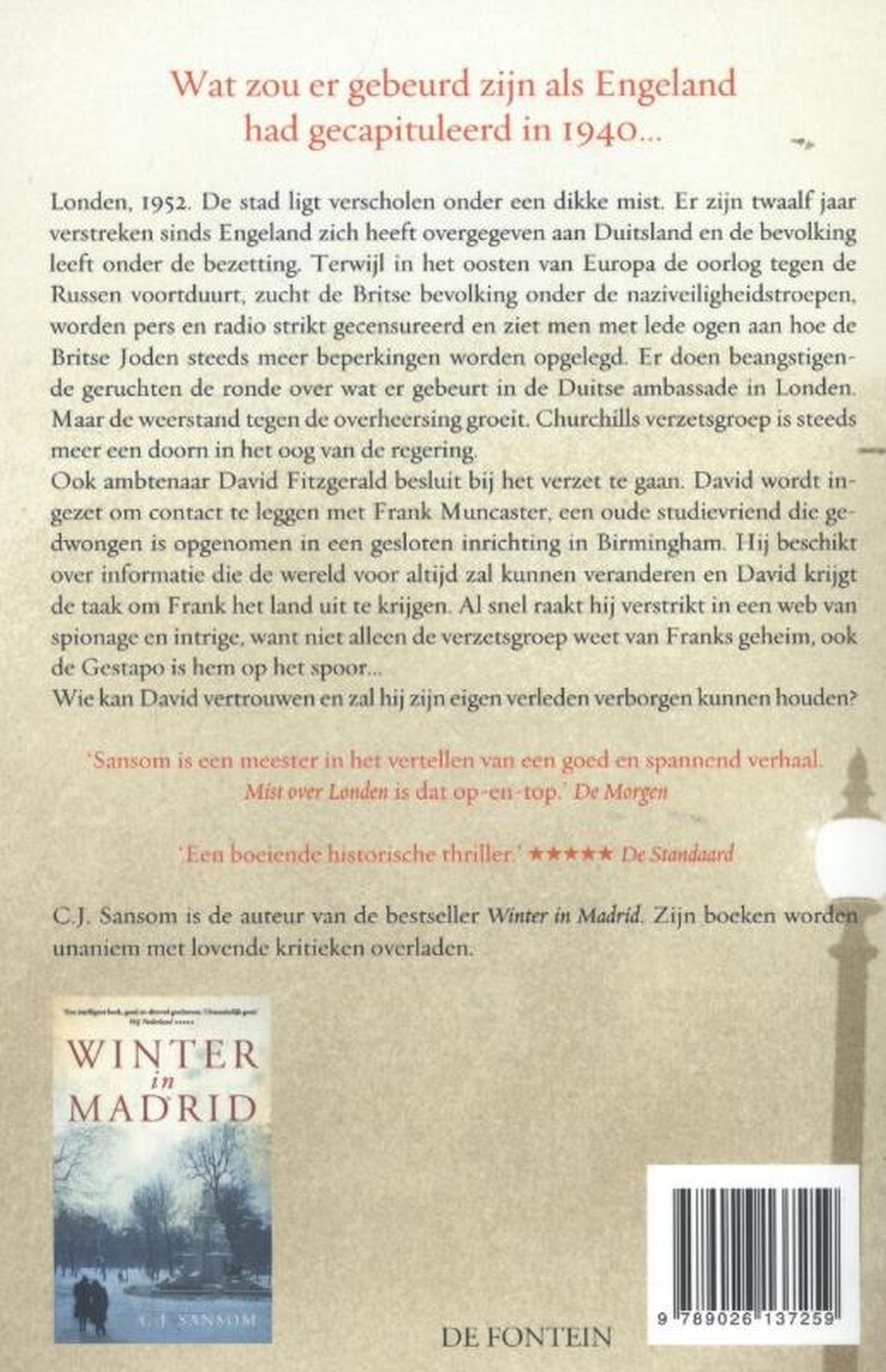 Wat zou er gebeurd zijn als Engeland had gecapituleerd in 1940… Londen, 1952. De stad ligt verscholen onder een dikke mist. Er zijn twaalf jaar verstreken sinds Engeland zich heeft overgegeven aan Duitsland en de bevolking leeft onder de bezetting. Terwijl in het oosten van Europa de oorlog tegen de Russen voortduurt, zucht de Britse bevolking onder de nazi veiligheidstroepen, worden pers en radio strikt gecensureerd en ziet men met lede ogen aan hoe de Britse Joden steeds meer beperkingen worden opgelegd. Er doen beangstigende geruchten de ronde over wat er gebeurt in de Duitse ambassade in Londen. Maar de weerstand tegen de overheersing groeit. Churchills verzetsgroep is steeds meer een doorn in het oog van de regering. Ook ambtenaar David Fitzgerald besluit bij het verzet te gaan. David wordt ingezet om contact te leggen met Frank Muncaster, een oude studievriend van hem. Frank is gedwongen opgenomen in een gesloten inrichting in Birmingham. Hij beschikt over informatie die de wereld voor altijd zal kunnen veranderen en David krijgt de taak om Frank het land uit te krijgen. Al snel raakt hij verstrikt in een web van spionage en intrige, want niet alleen de verzetsgroep weet van Franks geheim, ook de Gestapo is hem op het spoor... Wie kan David vertrouwen en zal hij zijn eigen verleden verborgen kunnen houden? C.J. Sansom (1952) ontwaakte aan het eind van zijn tienerjaren uit een kleurloze jeugd als enig kind in een gezin waar geen boeken werden gelezen. Hij promoveerde als historicus, maar ging vervolgens rechten studeren. Nadat Sansom jarenlang als advocaat had gewerkt, bood een erfenis hem de kans om de Shardlake-serie te schrijven. Deze historische thrillerreeks werd inmiddels wereldwijd met lovende kritieken overladen.Zijn eerste historische thriller ‘Winter in Madrid’ werd een wereldwijde bestseller. ‘Er zijn dit jaar weinig historische romans verschenen die zo goed zijn.’ The Sunday Times ‘Elk detail klopt… Als historische roman én als thriller is ‘Mist over Londen’ boeiend, scherp en beklemmend.’ Independent on Sunday ‘Een fascinerende, doordachte spionagethriller… Beeldend en goed getroffen, met een zeer overtuigend what-if.’ The Times ‘Een fantastische roman die vooropgezette meningen over onze geschiedenis opschudt, terwijl de rillingen je over de rug lopen.’ The Guardian ‘Historici zien what-if plots als de speed van hun vak, om goedkoop high van te worden. Maar romanschrijvers scheppen een parallelle werkelijkheid met ieder boek.’ Independent ‘Mist over Londen’ is een van die zeldzame boeken die niet alleen spannend zijn, maar ook aanzetten tot nadenken.’ Spectator ‘Spannend en met meeslepende plotwendingen, maar wat dit prachtige boek echt onderscheidt is de precieze beschrijving van een samenleving die zomaar werkelijkheid had kunnen zijn.’ Literary Review