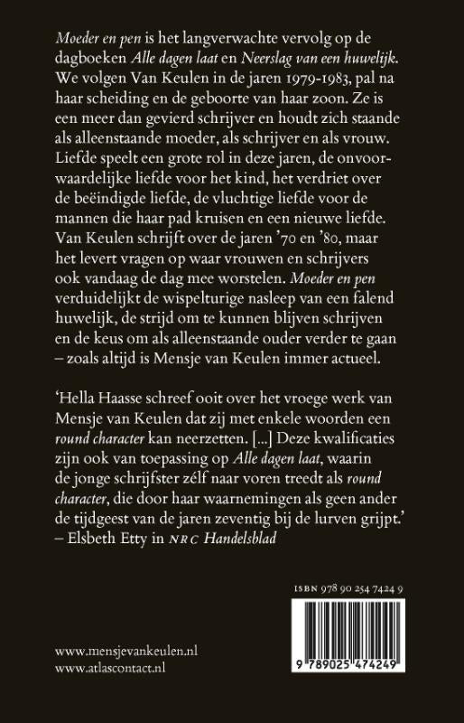 Liefde speelt een grote rol in deze jaren, de onvoorwaardelijke liefde voor het kind, het verdriet over de beëindigde liefde, de vluchtige liefde voor de mannen die haar pad kruisen en een nieuwe liefde. Van Keulen schrijft over de jaren ’70 en ’80, maar het levert vragen op waar vrouwen en schrijvers ook vandaag de dag mee worstelen. ‘Moeder en pen’ verduidelijkt de wispelturige nasleep van een falend huwelijk, de strijd om te kunnen blijven schrijven en de keus om als alleenstaande ouder verder te gaan – zoals altijd is Mensje van Keulen immer actueel.