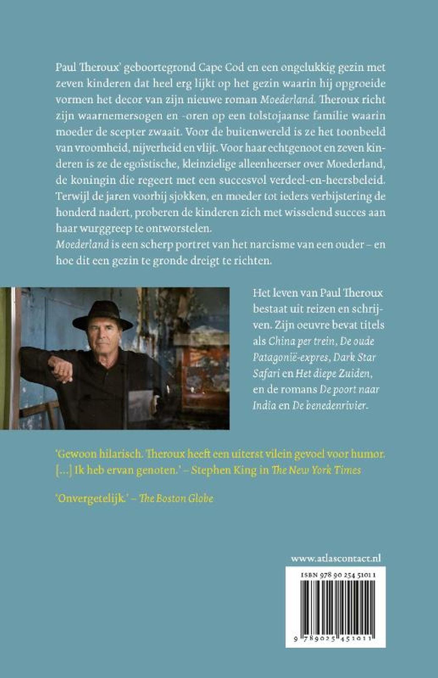 Paul Theroux' geboortegrond Cape Cod en een ongelukkig gezin met zeven kinderen dat heel erg lijkt op het gezin waarin hij opgroeide vormen het decor van zijn nieuwe roman 'Moederland'. Theroux richt zijn waarnemersogen en -oren op een Tolstojaanse familie waarin moeder de scepter zwaait. Voor de buitenwereld is ze het toonbeeld van vroomheid, nijverheid en vlijt. Voor haar echtgenoot en zeven kinderen is ze de egoïstische, kleinzielige alleenheerser over Moederland, de koningin die regeert met een succesvol verdeel-en-heersbeleid. Terwijl de jaren voorbij sjokken, en moeder tot ieders verbijstering de honderd nadert, proberen de kinderen zich met wisselend succes aan haar wurggreep te ontworstelen.