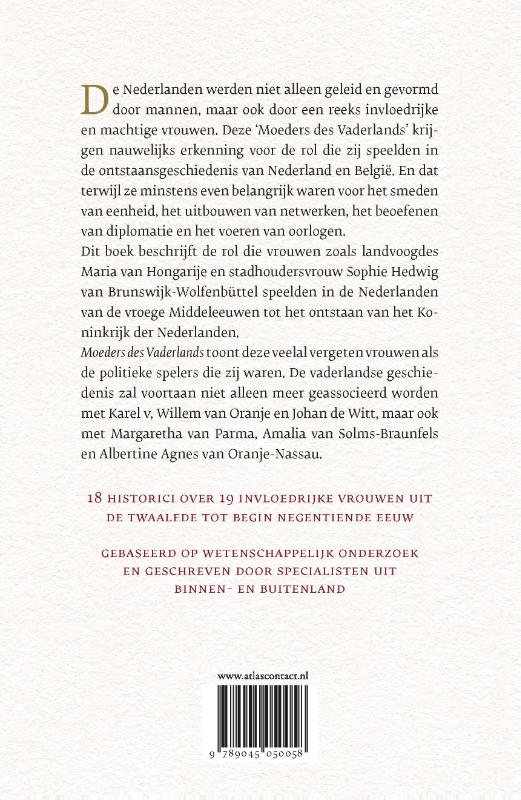 De Nederlanden werden niet alleen geleid en gevormd door mannen, maar ook door een reeks invloedrijke en machtige vrouwen. Deze Moeders des Vaderlands krijgen nauwelijks erkenning voor de rol die zij speelden in de ontstaansgeschiedenis van Nederland en België. En dat terwijl ze minstens even belangrijk waren voor het smeden van eenheid, het uitbouwen van netwerken, het beoefenen van diplomatie en het voeren van oorlogen. Dit boek beschrijft de rol die vrouwen zoals landvoogdes Maria van Hongarije en stadhoudersvrouw Sophie Hedwig van Brunswijk speelden in de Nederlanden van de vroege Middeleeuwen tot het ontstaan van het koninkrijk der Nederlanden.