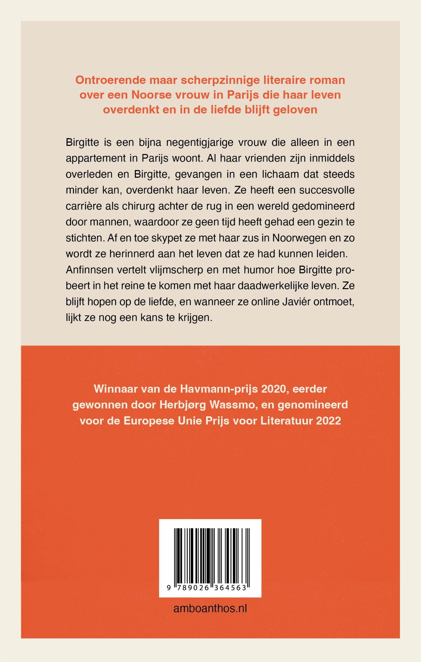Birgitte is een bijna negentigjarige vrouw die alleen in een appartement in Parijs woont. Al haar vrienden zijn inmiddels overleden en Birgitte, gevangen in een lichaam dat steeds minder kan, overdenkt haar leven. Ze heeft een succesvolle carrière als chirurg achter de rug in een wereld gedomineerd door mannen, waardoor ze geen tijd heeft gehad een gezin te stichten. Af en toe skypet ze met haar zus in Noorwegen en zo wordt ze herinnerd aan het leven dat ze had kunnen leiden. Anf nnsen vertelt vlijmscherp en met humor hoe Birgitte probeert in het reine te komen met haar daadwerkelijke leven. Ze blijft hopen op de liefde, en wanneer ze online Javiér ontmoet, lijkt ze nog een kans te krijgen.