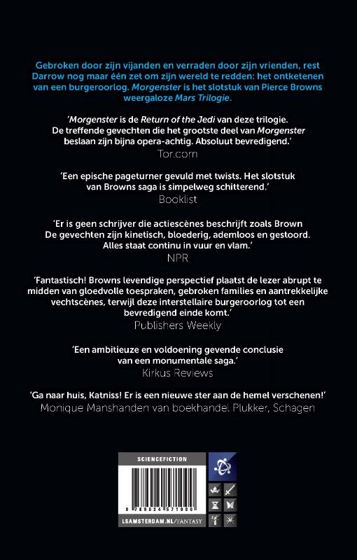 Morgenster is het derde deel van de Mars Trilogie van bestsellerauteur Pierce Brown. En het vervolg op Rood en Gouden Zoon, de meedogenloos spannende boeken over Darrow, de held van Mars.