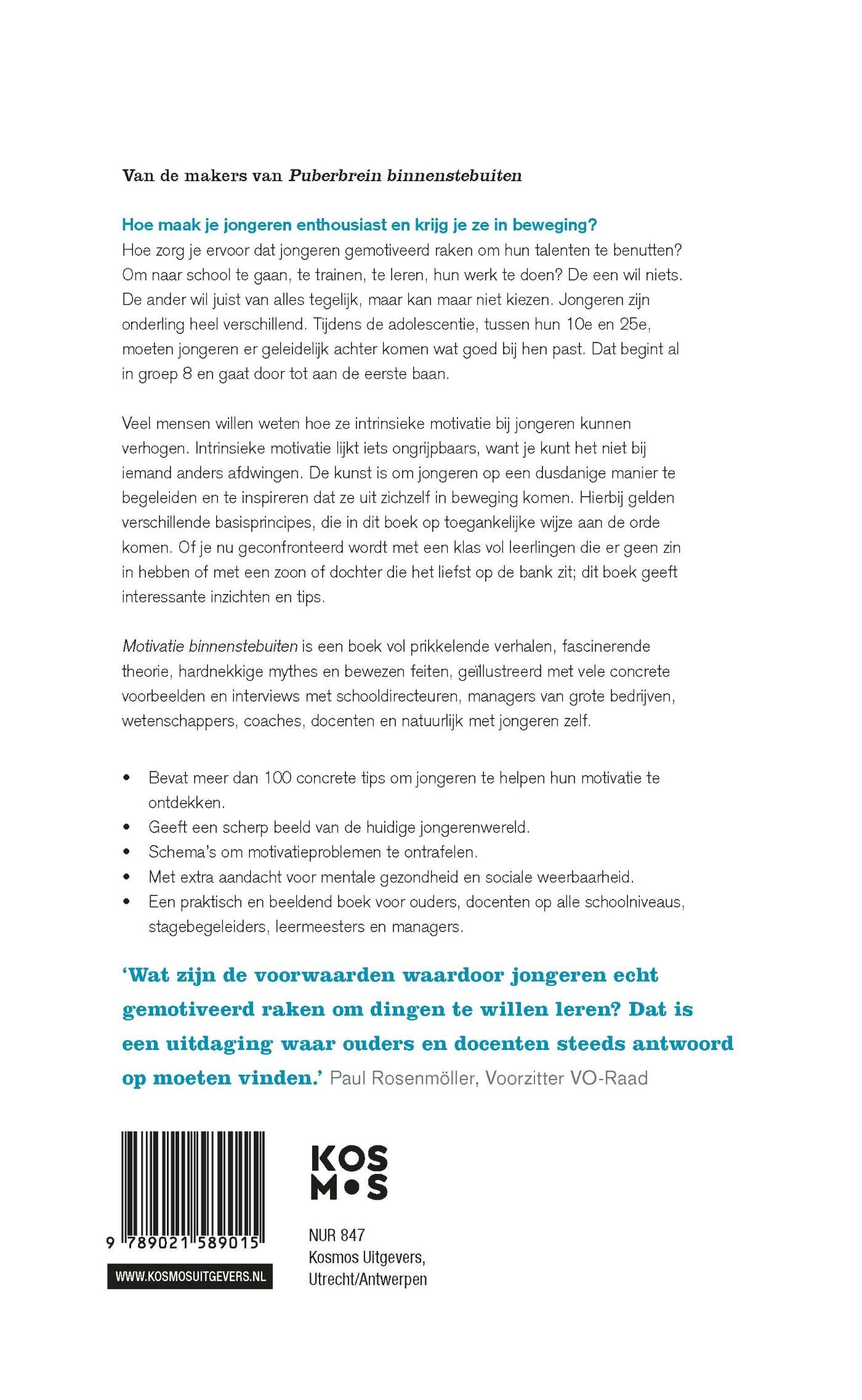 'Motivatie binnenstebuiten' van Huub Nelis en Yvonne van Sark is het vervolg van het succesvolle 'Puberbrein binnenstebuiten'. In dit praktische boek vind je antwoorden op de vraag ‘Hoe raken jongeren gemotiveerd om iets te willen bereiken?' Belangrijk is in ieder geval dat jongeren perspectief ervaren, het gevoel hebben ergens naar op weg te zijn. Zeker in tijden van crisis – zoals de corona pandemie, maar ook een echtscheiding of een sterfgeval – komt juist dit onder druk te staan. Dit praktische boek vertelt ouders, docenten en professionals hoe ze jongeren kunnen ondersteunen door met hen in gesprek te gaan, samen structuur aan te brengen en de keuzes in kaart te brengen. Met praktische tips en herkenbare verhalen.