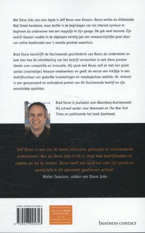 Brad Stone beschrijft in Mr. Amazon de fascinerende geschiedenis van Jeff Bezos als ondernemer en laat zien hoe de ontwikkeling van het bedrijf vervlochten is met diens grootse ideeën over competitie en innovatie. Wat Steve Jobs was voor Apple is Jeff Bezos voor Amazon. Bezos werkte als dikbetaalde Wall Street-handelaar, maar durfde in de begindagen van het internet opnieuw te beginnen als ondernemer met een magazijn in zijn garage. Die gok werd beloond. Zijn bedrijf Amazon maakte in de afgelopen twintig jaar een onwaarschijnlijke groei door: van online boekhandel naar 's werelds grootste warenhuis.