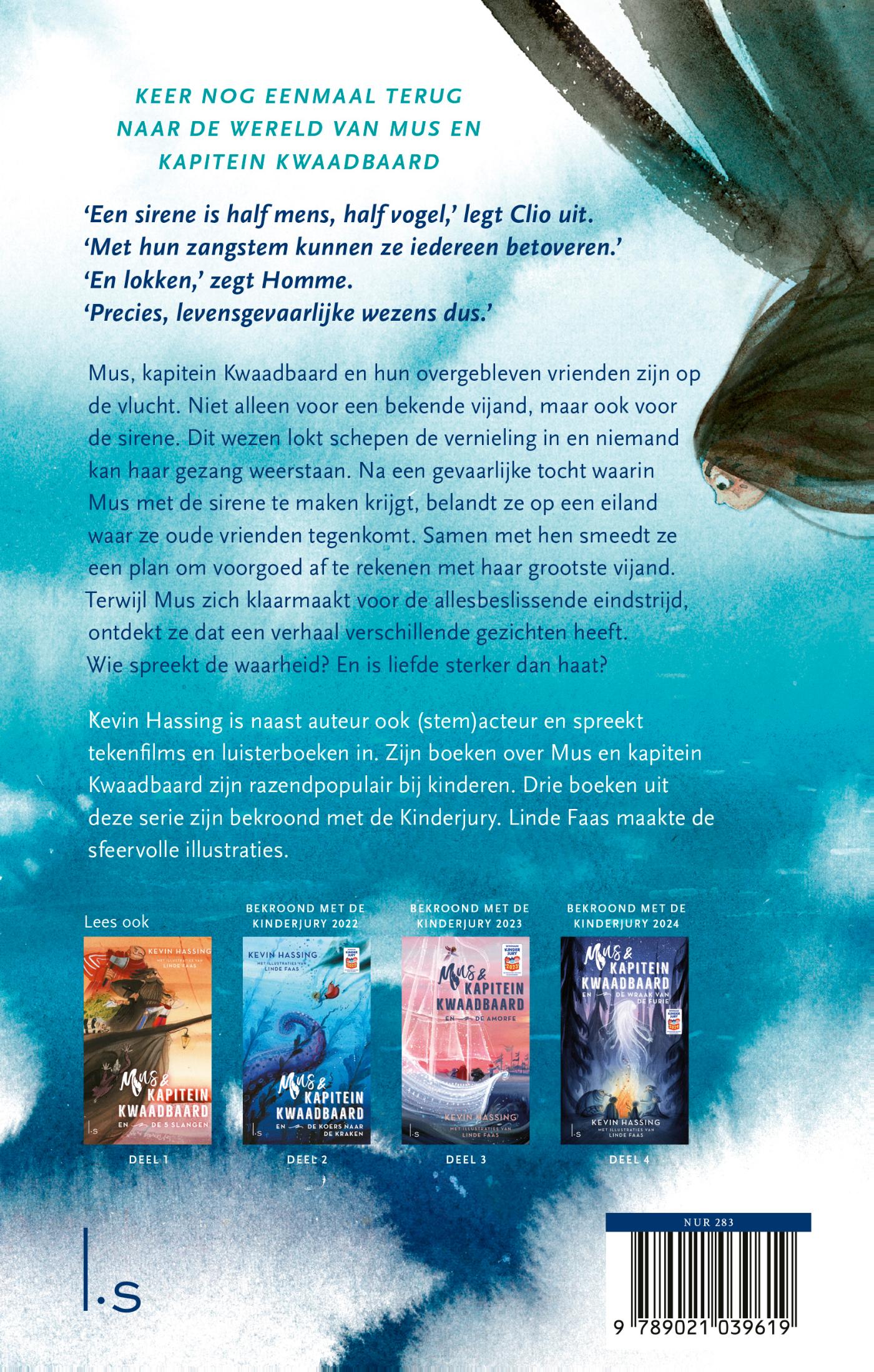 De laatste sirene is het vijfde deel over Mus en kapitein Kwaadbaard van drievoudig Kinderjury-winnaar Kevin Hassing. Met prachtige fullcolourillustraties van Linde Faas. Mus, kapitein Kwaadbaard en hun overgebleven vrienden zijn op de vlucht. Niet alleen voor een bekende vijand, maar ook voor de sirene. Dit wezen – half meisje, half vogel – lokt schepen de vernieling in en niemand kan haar gezang weerstaan. Na een gevaarlijke tocht belandt Mus op een eiland waar ze oude vrienden tegenkomt. Samen met de kleurrijke eilandbewoners smeedt ze een plan om voorgoed af te rekenen met oud zeer en nieuw kwaad. Is liefde sterker dan haat? En wie overleeft de allesbeslissende strijd tussen goed en kwaad? Het eerste deel over Mus, De 5 Slangen, was genomineerd voor de Hotze de Roosprijs en stond op de Tiplijst van de Kinderjury 2021. Daarna volgden De koers naar de Kraken (deel 2), bekroond met de Kinderjury 2022, De Amorfe (deel 3), bekroond met de Kinderjury 2023, en De wraak van de furie (deel 4), bekroond met de Kinderjury 2024.