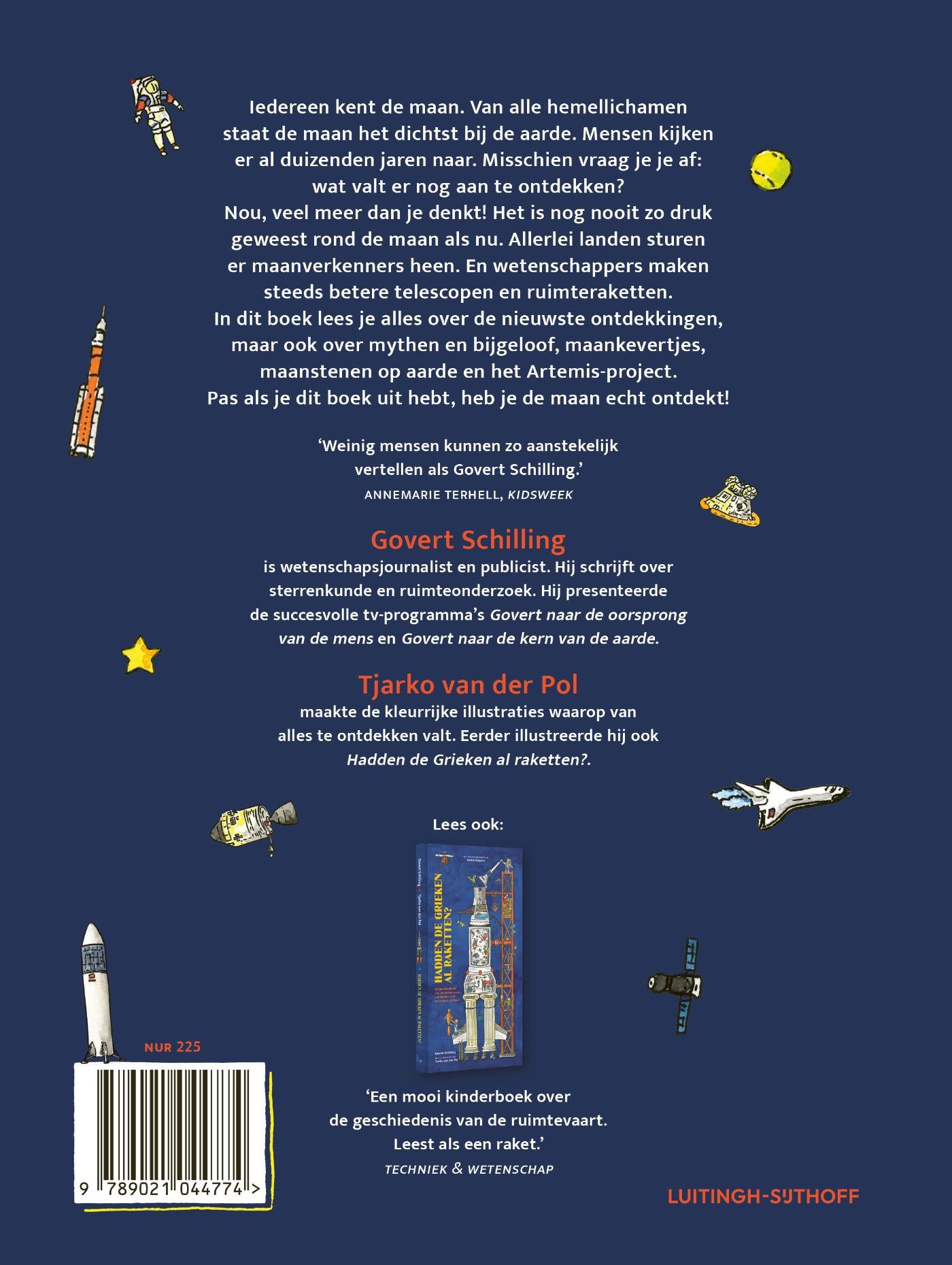 Duizenden jaren lang vormde de maan een inspiratiebron voor verhalenvertellers en kunstenaars. Van mythen en bijgeloof tot schijngestalten en verduisteringen; van achterhaalde ideeën over het leven op de maan tot de nieuwste resultaten van de wetenschap – Govert Schilling behandelt het allemaal in dit boek. Illustrator Tjarko van der Pol maakte de geweldige, gedetailleerde tekeningen waarop van alles te ontdekken valt.