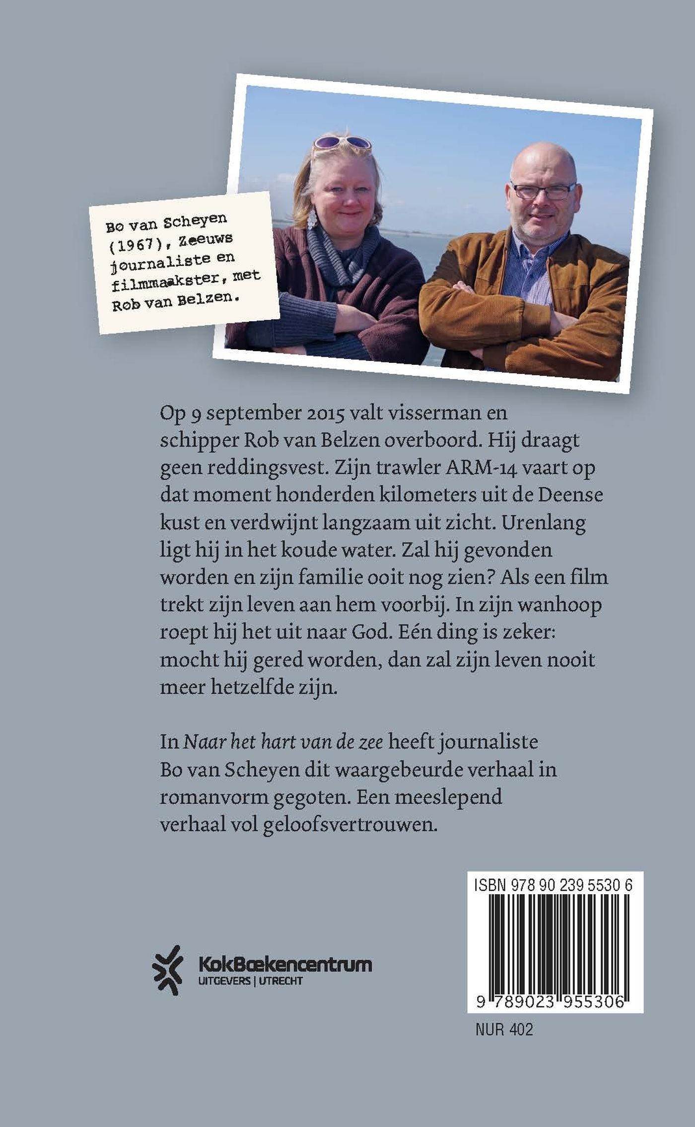 Een meeslepend verhaal vol geloofsvertrouwen over de wonderlijke redding van een Zeeuwse visser. Op 9 september 2015 valt visserman en schipper Rob van Belzen overboord. Hij draagt geen reddingsvest. Zijn trawler ARM-14 vaart op dat moment honderden kilometers uit de Deense kust en verdwijnt langzaam uit zicht. Urenlang ligt hij in het koude water. Zal hij gevonden worden en zijn familie ooit nog zien? Als een film trekt zijn leven aan hem voorbij. In zijn wanhoop roept hij het uit naar God. Eén ding is zeker: mocht hij gered worden, dan zal zijn leven nooit meer hetzelfde zijn. In Naar het hart van de zee heeft journaliste Bo van Scheyen dit waargebeurde verhaal in romanvorm gegoten.