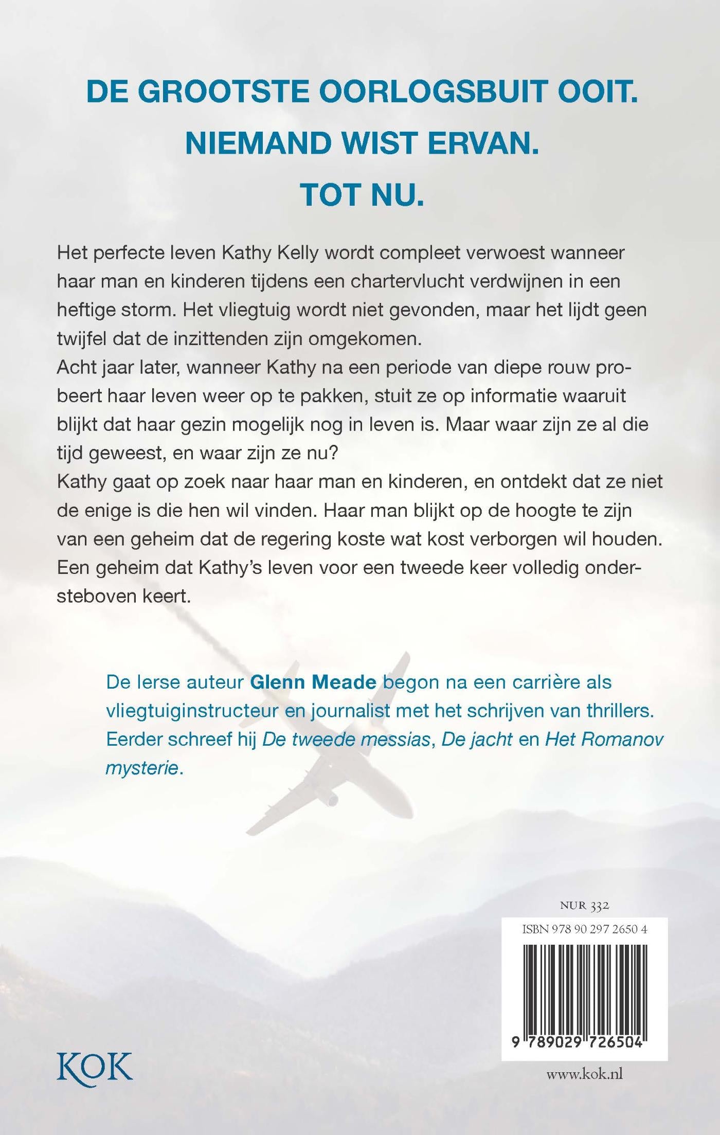 In de thriller ‘Nachtvlucht’ van Glenn Meade komt een man de 8 miljard dollar op het spoor die in 2003 verdween tijdens de Irakoorlog. Een ontdekking die hij met zijn leven zal moeten betalen… Met haar liefhebbende echtgenoot en twee prachtige kinderen leidt Kathy Kelly een perfect leven tot het op een nacht compleet wordt verwoest. Haar man en kinderen verdwijnen tijdens een chartervlucht in een heftige storm. Het vliegtuig wordt niet gevonden, maar het lijdt geen twijfel dat ze zijn omgekomen. Na een periode van diepe rouw, krabbelt Kathy weer op en wordt ze zelfs verliefd. Maar dan stuit ze op informatie waaruit blijkt dat haar gezin nog in leven is en dat haar man met opzet verdween met hun kinderen. Ze weet niet hoe snel ze naar hen op zoek moet gaan. Algauw ontdekt ze dat ze niet de enige is die hen wil vinden. Haar man blijkt op de hoogte te zijn van een geheim dat de regering koste wat kost verborgen wil houden. Een geheim dat als een doos van Pandora een oneindige stroom van wraak kan ontketenen. Een geheim dat Kathy’s leven voor een tweede keer volledig ondersteboven keert. De Ierse schrijver Glenn Meade schreef onder andere ook de thrillers ‘De jacht’, ‘Het Romanov mysterie’ en ‘De tweede messias’.