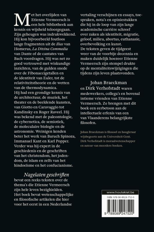 Johan Braeckman en Dirk Verhofstadt waren medewerkers, collega’s en bovenal intieme vrienden van Etienne Vermeersch. Ze brengen met dit boek een eerbetoon aan de intellectuele erfenis van een van Vlaanderens belangrijkste filosofen.