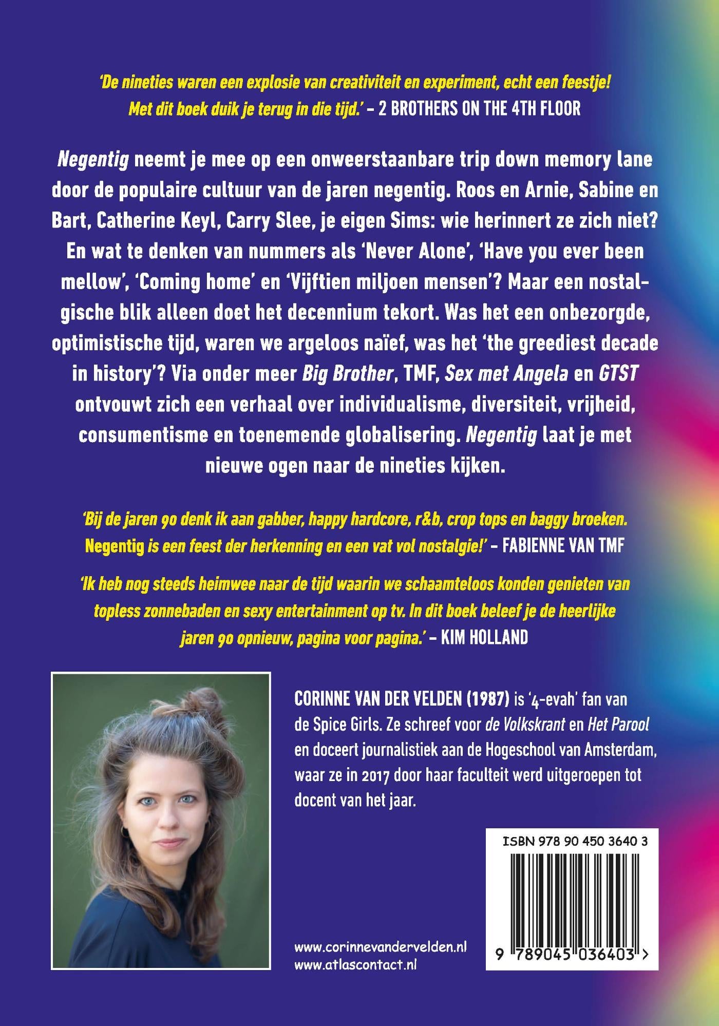 Corinne van der Velden neemt je in ‘Negentig’ mee op een onweerstaanbare trip down memory lane door de populaire cultuur van de jaren negentig. Roos en Arnie, Sabine en Bart, Catherine Keyl, Carry Slee, je eigen Sims: wie herinnert ze zich niet? En wat te denken van nummers als ‘Never Alone’, ‘Have you ever been mellow’, ‘Coming home’ en ‘Vijftien miljoen mensen’? Maar een nostalgische blik alleen doet het decennium tekort. Was het een onbezorgde, optimistische tijd, waren we argeloos naïef, was het ‘the greediest decade in history’? Via ‘Big Brother’, TMF, ‘Sex met Angela’ en ‘GTST’ ontvouwt zich een verhaal over individualisme, diversiteit, vrijheid, consumentisme en toenemende globalisering. ‘Negentig’ laat je met nieuwe ogen naar de nineties kijken.