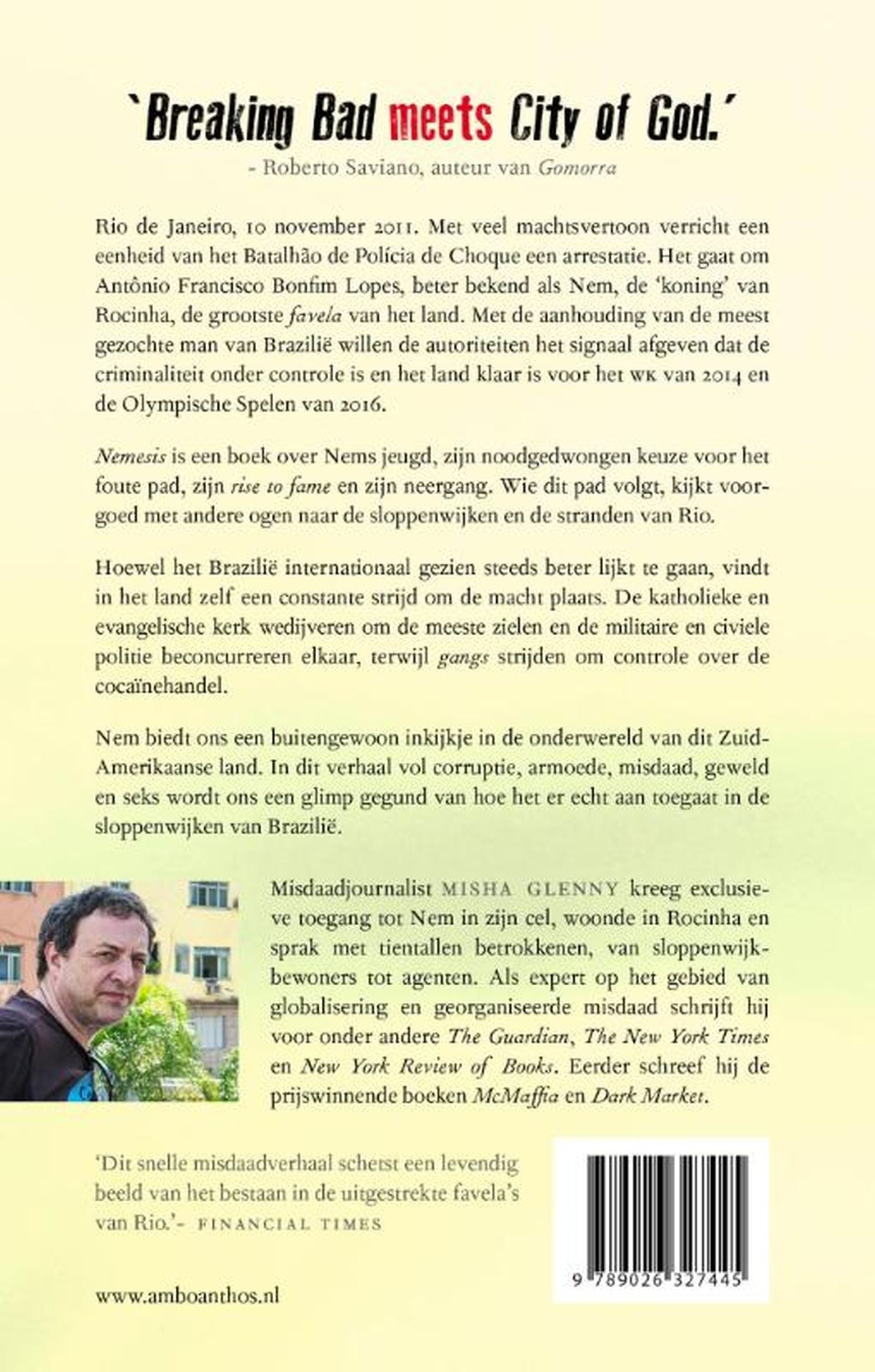 Nemesis is een boek over Nems jeugd, zijn noodgedwongen keuze voor het foute pad, zijn rise to fame en zijn neergang. Wie dit pad volgt, kijkt voorgoed met andere ogen naar de sloppenwijken en de stranden van Rio.