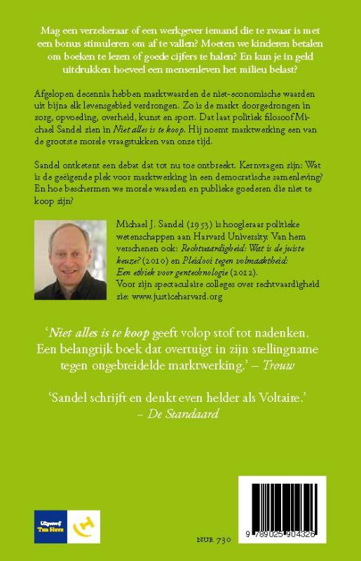 In 'Niet alles is te koop' behandelt de Amerikaanse Harvardfilosoof Michael J. Sandel een van de grootste morele vraagstukken van onze tijd: Is er niet iets mis met een wereld waarin alles te koop is? En zo ja, wat kunnen we doen om te voorkomen dat marktwaarden gebieden binnendringen waar ze niet thuishoren? Afgelopen decennia hebben marktwaarden de niet-economische normen uit bijna elk levensgebied verdrongen: dat zien we in de zorg, opvoeding, overheid, kunst en sport, en zelfs in het gezinsleven en persoonlijke relaties. Volgens Sandel zijn we zonder dat we het weten uit een markteconomie in een marktgestuurde samenleving beland.