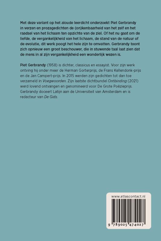 Met deze variant op het aloude leerdicht onderzoekt Piet Gerbrandy in verzen en prozagedichten de (on)kenbaarheid van het zelf en het raadsel van het lichaam ten opzichte van de ziel. Of het nu gaat om de liefde, de vergankelijkheid van het lichaam, de stand van de natuur of de evolutie. Dit werk poogt het hele zijn te omvatten in onderzoekende, gelaagde en toegankelijke verzen.