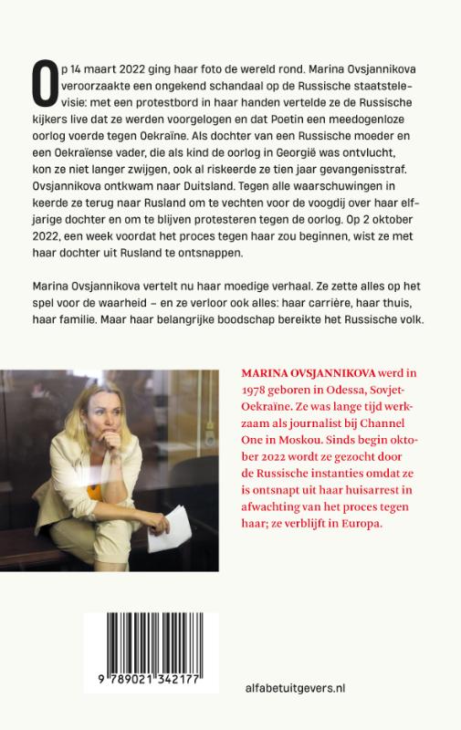 Op 14 maart 2022 ging haar foto de wereld rond. Marina Ovsjannikova veroorzaakte een ongekend schandaal op de Russische staatstelevisie: tijdens een spectaculair protest brak ze door de beveiliging in de redactiekamer. Ze vertelde de Russische kijkers live dat ze werden voorgelogen en dat Poetin een meedogenloze oorlog voerde tegen Oekraïne – informatie die de staatspropaganda tot dusver had verzwegen. Met deze heldhaftige daad riskeerde ze tot tien jaar gevangenisstraf. Marina wist op tijd naar Duitsland te ontkomen. Aanvankelijk door de hele wereld geprezen als een held, kwam ze terecht in een informatieoorlog. Door sommigen werd ze weggezet als Britse spion, anderen dachten dat ze een FSB-agent was. Tegen alle waarschuwingen in keerde ze terug naar Rusland om te vechten voor de voogdij over haar elfjarige dochter en om te blijven protesteren tegen de oorlog. Op 2 oktober 2022, een week voor het proces tegen haar aanvang zou nemen, wist ze op spectaculaire wijze uit Rusland te ontsnappen.