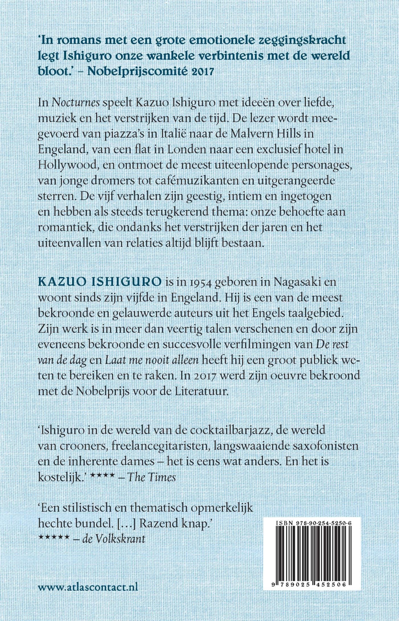 In ‘Nocturnes’ speelt Kazuo Ishiguro met ideeën over liefde, muziek en het verstrijken van de tijd. De lezer wordt meegevoerd van piazza’s in Italië naar de Malvern Hills in Engeland, van een flat in Londen naar een exclusief hotel in Hollywood, en ontmoet de meest uiteenlopende personages, van jonge dromers tot cafémuzikanten en uitgerangeerde sterren. De vijf verhalen zijn geestig, intiem en ingetogen en hebben als steeds terugkerend thema: onze behoefte aan romantiek, die ondanks het verstrijken der jaren en het uiteenvallen van relaties altijd blijft bestaan.