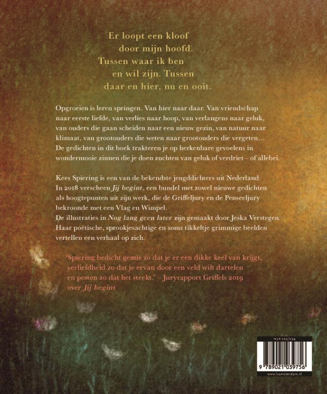 Nog lang geen later bevat uitsluitend nieuwe, nog niet eerder gepubliceerde gedichten over grote en kleine momenten in het leven van een opgroeiende jongere. In treffende, bloemrijke zinnen schrijft Spiering over vriendschap, eerste liefde, verlies, hoop, geluk, het klimaat, verlangens, ouders die gaan scheiden en nog veel meer. Als geen ander trekt hij de lezers zijn beeldende wereld in en trakteert hij hen op verrassende observaties en fonkelende zinnen die je doen zuchten van geluk of verdriet – of allebei.