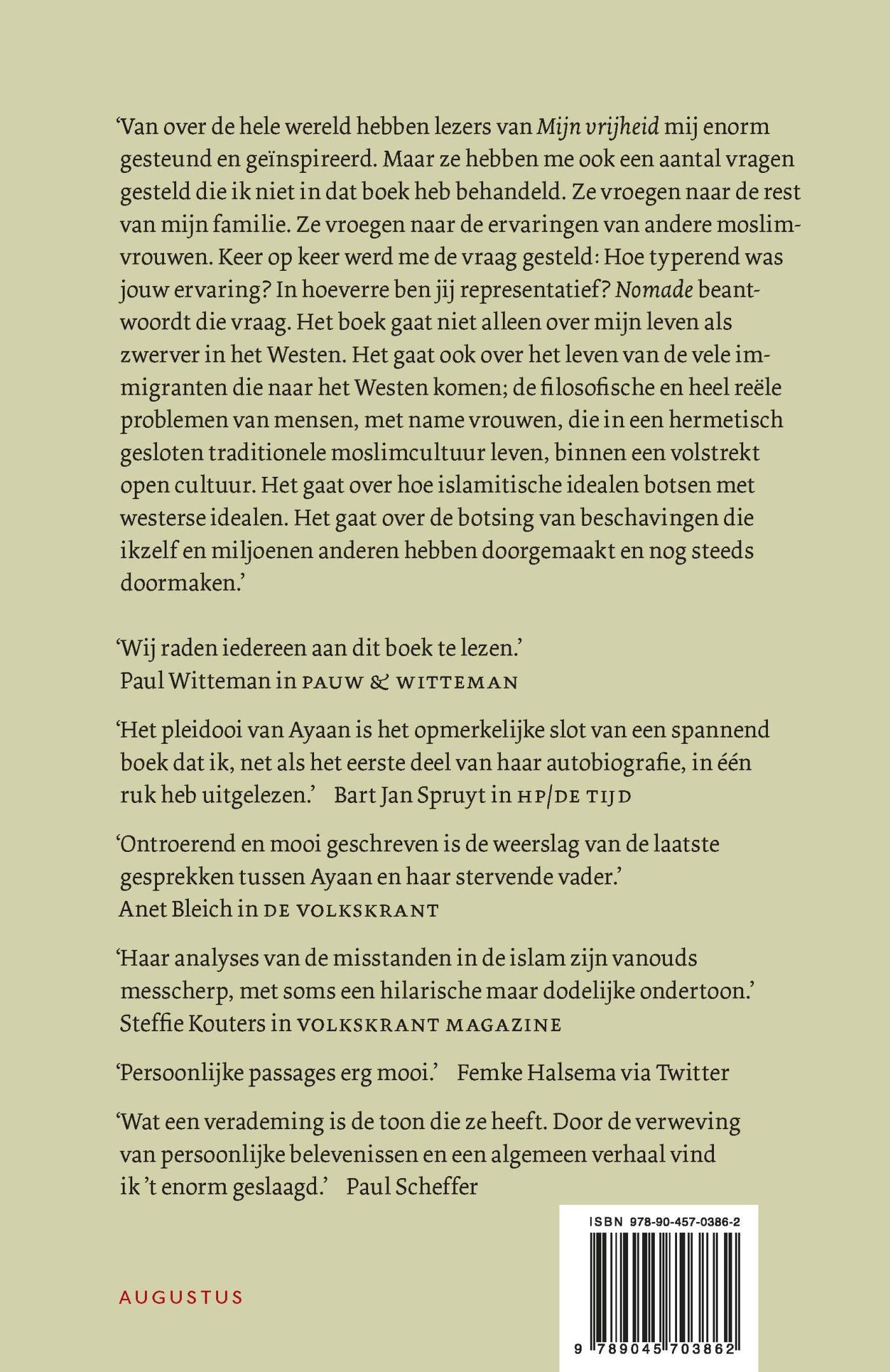 Van over de hele wereld hebben lezers van Mijn vrijheid mij enorm gesteund en geïnspireerd. Maar ze hebben me ook een aantal vragen gesteld die ik niet in dat boek heb behandeld. Ze vroegen naar de rest van mijn familie. Ze vroegen naar de ervaring van andere moslimvrouwen. Keer op keer werd me de vraag gesteld: Hoe typerend was jouw ervaring? In hoeverre ben jij representatief? Nomade beantwoordt die vraag. Het boek gaat niet alleen over mijn leven als zwerver in het Westen. Het gaat ook over het leven van de vele immigranten die naar het Westen komen; de filosofische en heel reële problemen van mensen, met name vrouwen, die in een hermetisch gesloten traditionele moslimcultuur leven, binnen een volstrekt open cultuur. Het gaat over hoe islamitische idealen botsen met Westerse idealen. Het gaat over de botsing van beschavingen die ikzelf en miljoenen anderen hebben doorgemaakt en nog steeds doormaken.''