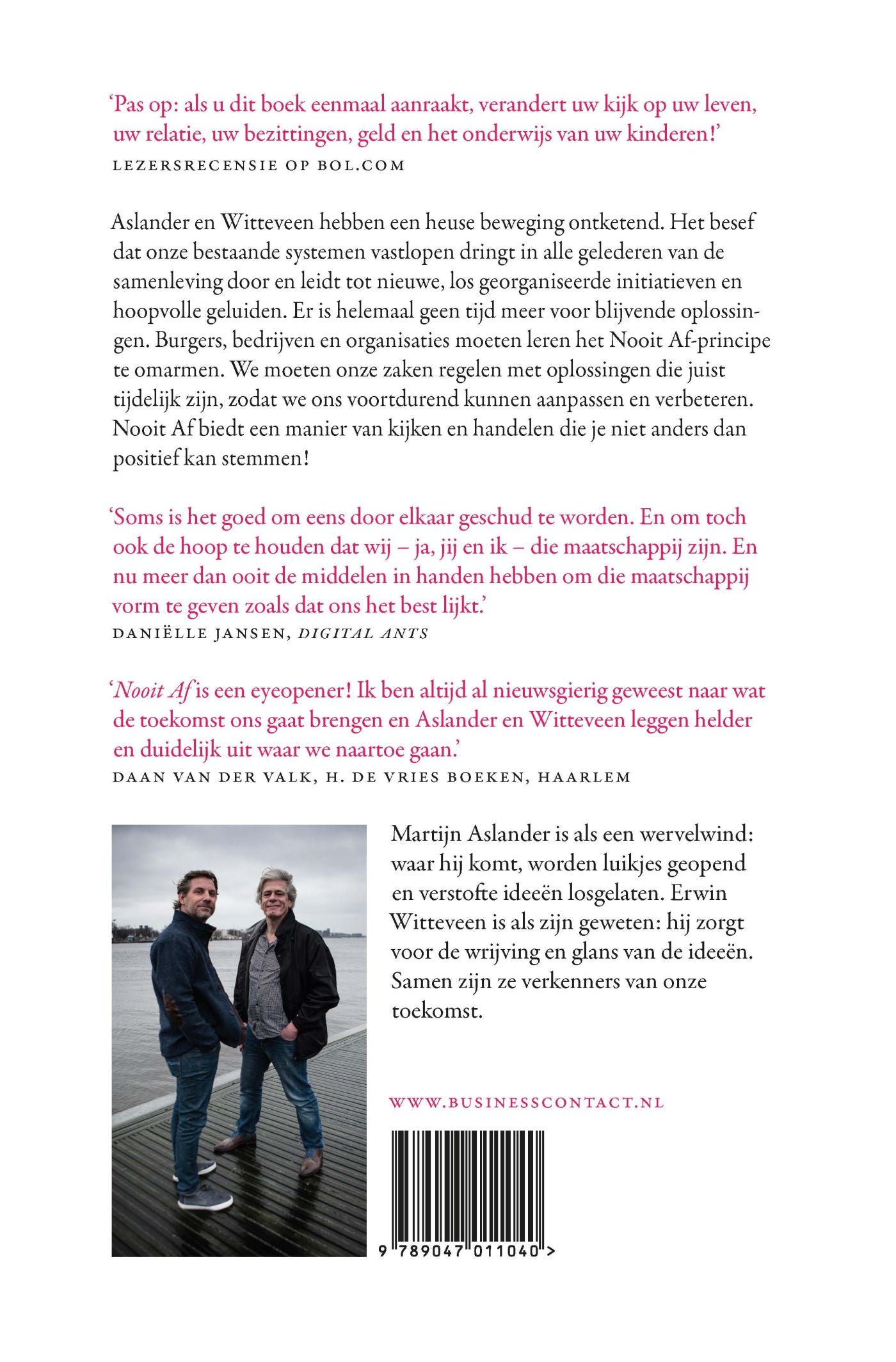 Nooit Af is een boek zoals je ze niet vaak tegenkomt: het schetst een caleidoscopisch beeld van alle ontwikkelingen in onze maatschappij – zowel op persoonlijk vlak als voor bestuurders van organisaties en van ons land – én het
