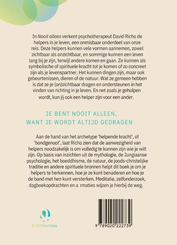 In 'Nooit alleen' verkent psychotherapeut David Richo de helpers in je leven. Deze helpers kunnen zichtbaar zijn, maar ook onzichtbaar. Sommige zijn een leven lang bij je, andere komen en gaan. Het kunnen spirituele krachten zijn, of je levenspartner. Het kunnen zelfs dingen zijn, gebeurtenissen, dieren of de natuur. Maar ze hebben allemaal gemeen dat je ze nodig hebt om prettig te leven. Jij kunt natuurlijk ook een helper zijn voor een ander.