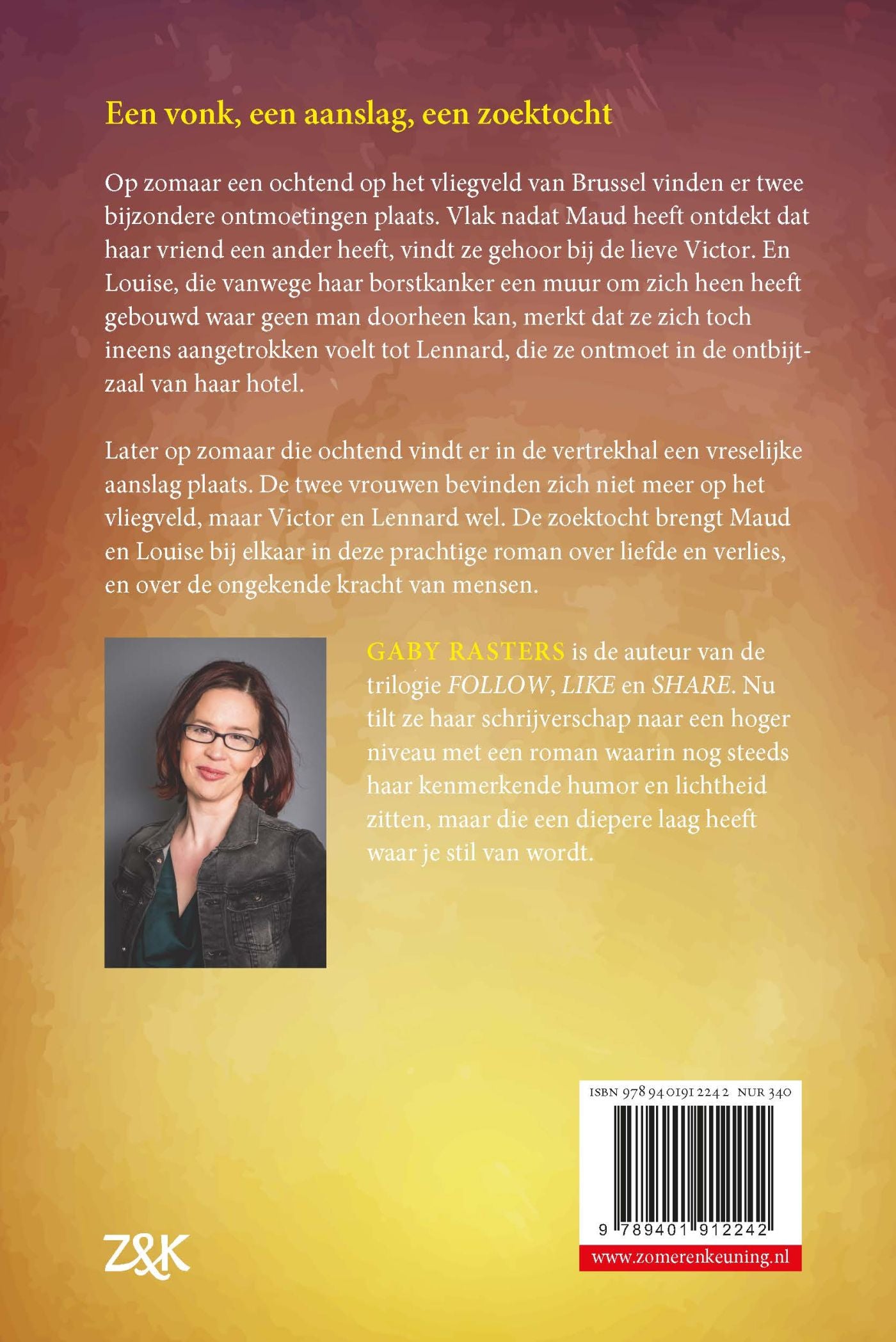 Hoofdpersoon Louise uit ‘Nooit meer bang’ van Gaby Rasters heeft de mannen afgezworen. Maar dan ontmoet ze bij het ontbijt in haar Brusselse hotel Lennard. Het is liefde op het eerste gezicht en ze rijdt hoteldebotel terug naar huis, terwijl hij naar het vliegveld gaat. In de auto belt ze haar beste vriendin om te vertellen over de ontmoeting. Die vraagt meteen: ‘Luister jij geen radio? Er is een aanslag gepleegd…’ Het is het begin van een zoektocht. Naar liefde, naar hoop, naar Lennard, naar zichzelf. ‘Nooit meer bang’ is Gaby Rasters’ eerste standalone, na de trilogie ‘FOLLOW’, ‘LIKE’ en ‘SHARE’