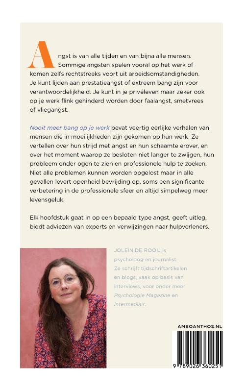 Nooit meer bang op je werk bevat veertig eerlijke verhalen van mensen die in moeilijkheden zijn gekomen op hun werk. Ze vertellen over hun strijd met angst en hun schaamte erover, en over het moment waarop ze besloten niet langer te zwijgen, hun probleem onder ogen te zien en professionele hulp te zoeken. Niet alle problemen kunnen worden opgelost maar in alle gevallen levert openheid bevrijding op, soms een significante verbetering in de professionele sfeer en altijd simpelweg meer levensgeluk.