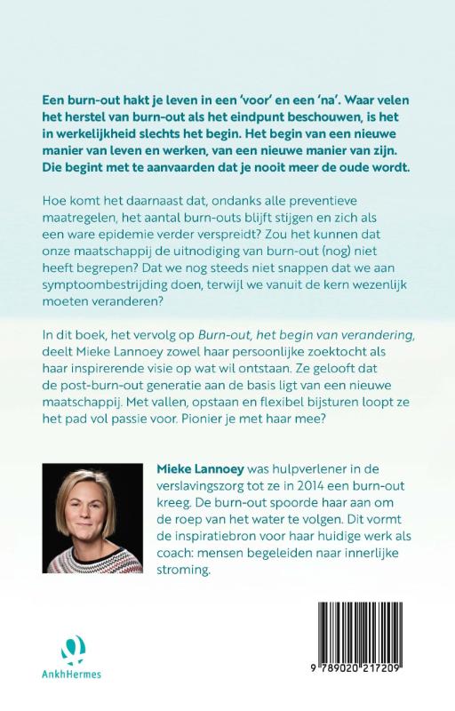 In dit boek, het vervolg op Burn-out, het begin van verandering, deelt Mieke Lannoey zowel haar persoonlijke zoektocht als haar inspirerende visie op wat wil ontstaan. Ze gelooft dat de post-burn-out generatie aan de basis ligt van een nieuwe maatschappij.