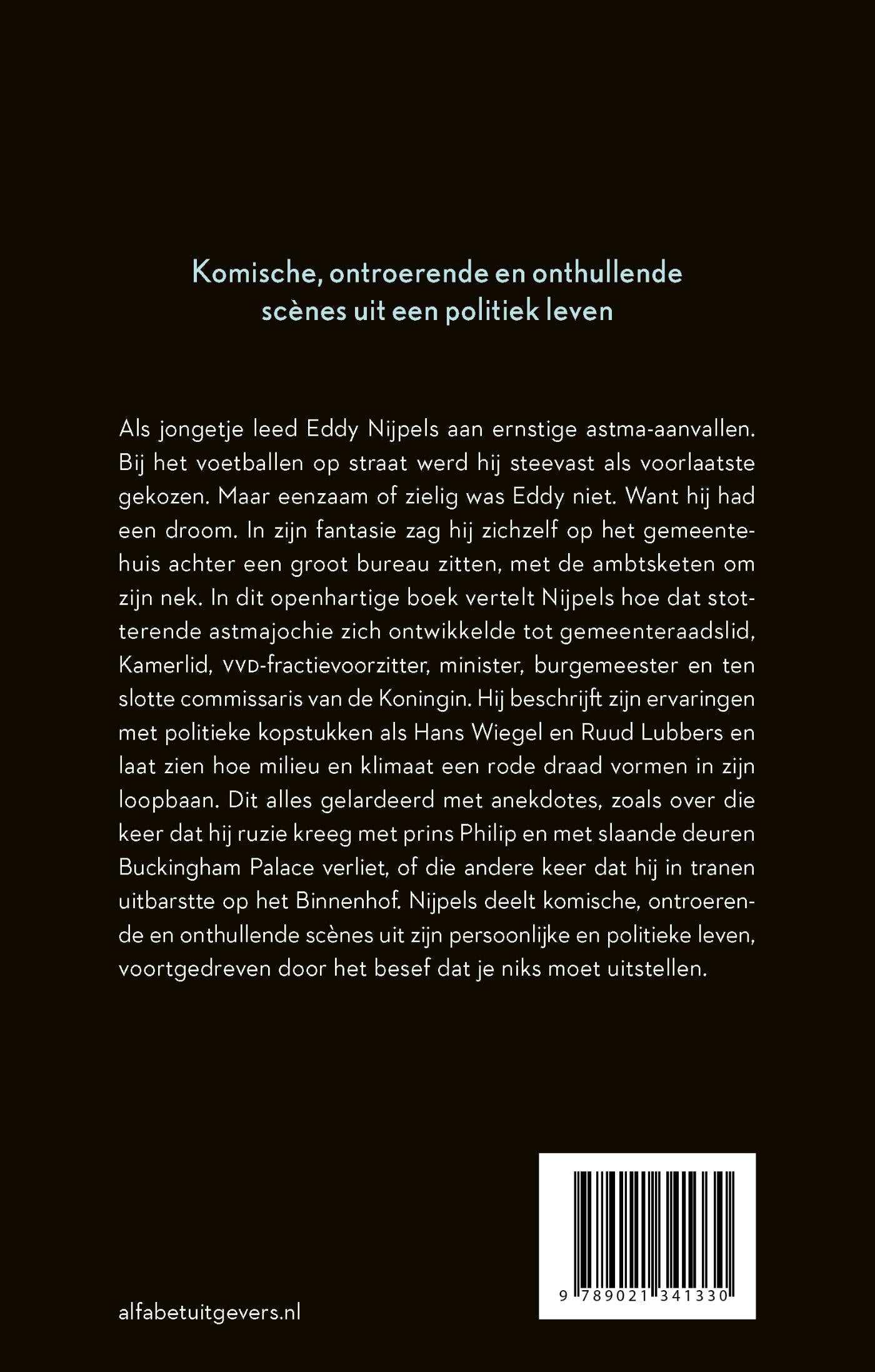 Als jongetje leed Eddy Nijpels aan ernstige astma-aanvallen. Bij het voetballen op straat werd hij steevast als voorlaatste gekozen. Maar eenzaam of zielig was Eddy niet. Want hij had een droom. In zijn fantasie zag hij zich op het gemeentehuis achter een groot bureau zitten, met de ambtsketen om zijn nek. In dit openhartige boek vertelt Nijpels hoe het stotterende astmajochie zich ontwikkelde tot gemeenteraadslid, Kamerlid, vvd-fractievoorzitter, minister, burgemeester en ten slotte commissaris van de Koningin. Hij beschrijft zijn ervaringen met politieke kopstukken als Hans Wiegel en Ruud Lubbers en laat zien hoe milieu en klimaat een rode draad vormen in zijn loopbaan. Dit alles gelardeerd met anekdotes, zoals over die keer dat hij ruzie kreeg met prins Philip en met slaande deuren Buckingham Palace verliet, of de keer dat hij in tranen uitbarstte op het Binnenhof. Nijpels deelt komische, ontroerende en onthullende scènes uit zijn persoonlijke en politieke leven, voortgedreven door het besef dat je niks moet uitstellen.
