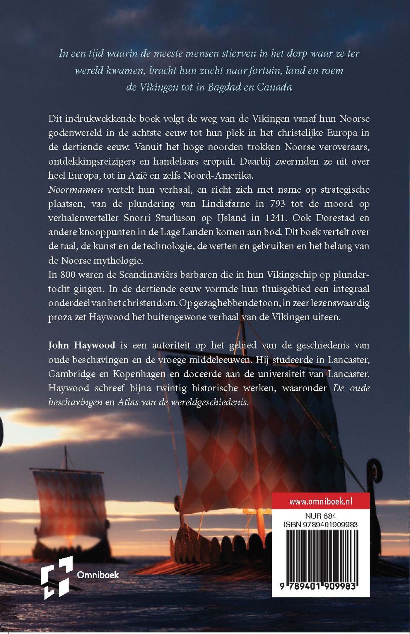‘Noormannen: de Vikingsaga 793-1241’ van John Haywood beschrijft de rijke cultuur van de Vikingen in de volle breedte. Dit indrukwekkende boek volgt de weg van de Vikingen vanaf hun Noorse godenwereld in de achtste eeuw tot hun plek in het christelijke Europa in de dertiende eeuw. Het vertelt over de taal, de kunst en de technologie, de wetten en gebruiken en het belang van de Noorse mythologie. Haywood schrijft aantrekkelijk proza, waardoor het verhaal voor een breed publiek toegankelijk wordt. Hij beschrijft de aanvallen in het noorden van Europa, de moord op de skald en over verhalenverteller Snorri Sturluson op IJsland. Haywood laat de saga’s herleven en vertelt over historische plaatsen in Amerika, Azië en Europa, met de Noormannen als ontdekkingsreizigers, veroveraars en kruisvaarders. Een uniek en bijzonder lezenswaardig werk.
