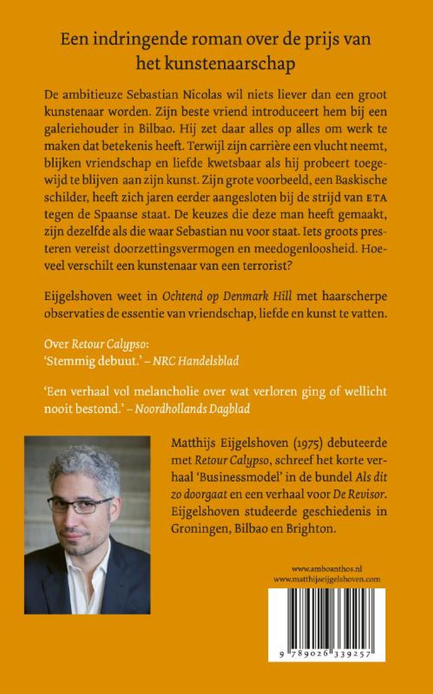 In ‘Ochtend op Denmark Hill’ weet Matthijs Eijgelshoven met haarscherpe observaties de essentie van vriendschap, liefde en kunst te vatten, in een verhaal dat het leven schetst zoals het is. ‘Ochtend op Denmark Hill’ heeft een sensitieve ondertoon, is in een vloeiende stijl geschreven die varieert in intensiteit en tempo. Eijgelshoven debuteerde met ‘Retour Calypso’ en leverde een bijdrage aan de succesvolle bundel van Auke Hulst ‘Als dit zo doorgaat’.