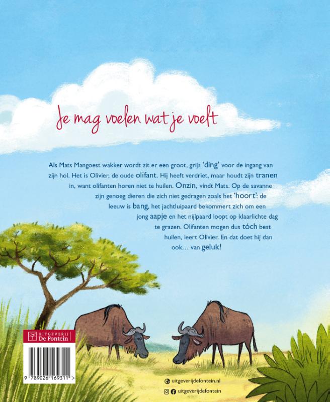 Als Mats Mangoest wakker wordt zit er een groot, grijs ‘ding’ voor de ingang van zijn hol. Het is Olivier, de oude olifant. Hij heeft verdriet, maar houdt zijn tranen in, want olifanten horen niet te huilen. Onzin, vindt Mats. Op de savanne zijn genoeg dieren die zich niet gedragen zoals het ‘hoort’: de leeuw is bang, het jachtluipaard bekommert zich om een jong aapje en het nijlpaard loopt op klaarlichte dag te grazen. Olifanten mogen dus tóch best huilen, leert Olivier. En dat doet hij dan ook… van geluk!