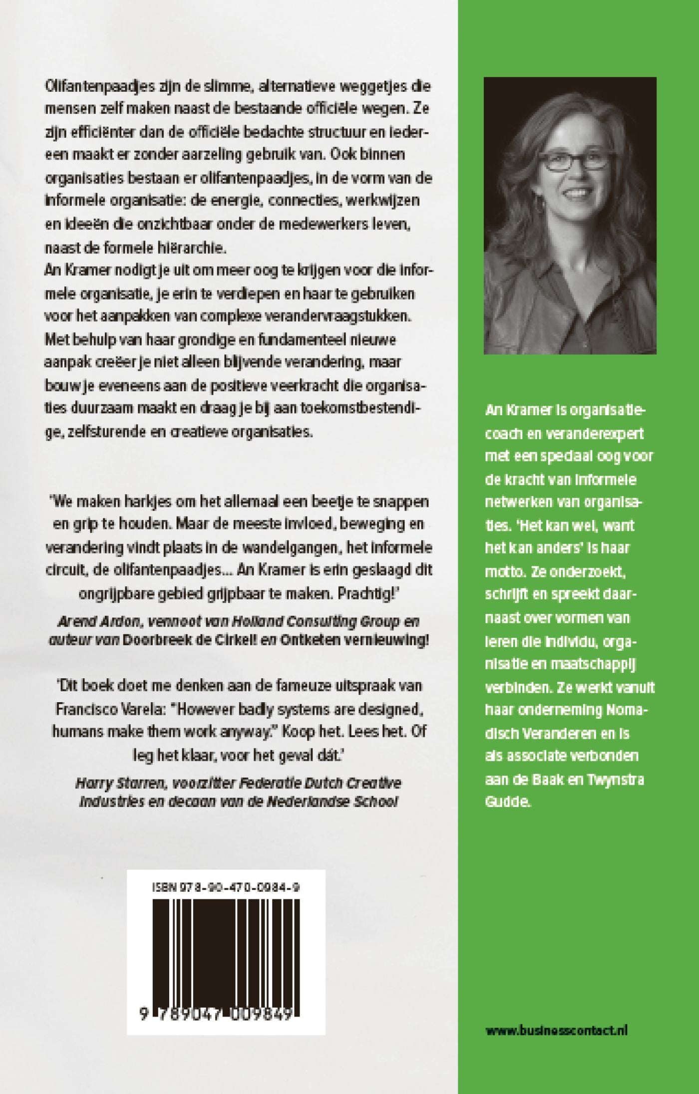 Olifantenpaadjes zijn de slimme, alternatieve weggetjes die mensen zelf maken naast de bestaande officiële wegen. Ze zijn efficiënter dan de officiële bedachte structuur en iedereen maakt er zonder aarzeling gebruik van. An Kramer laat zien dat er ook binnen organisaties olifantenpaadjes bestaan, in de vorm van de informele organisatie: de energie, connecties, werkwijzen en ideeën die onzichtbaar onder de medewerkers leven, naast de formele hiërarchie.