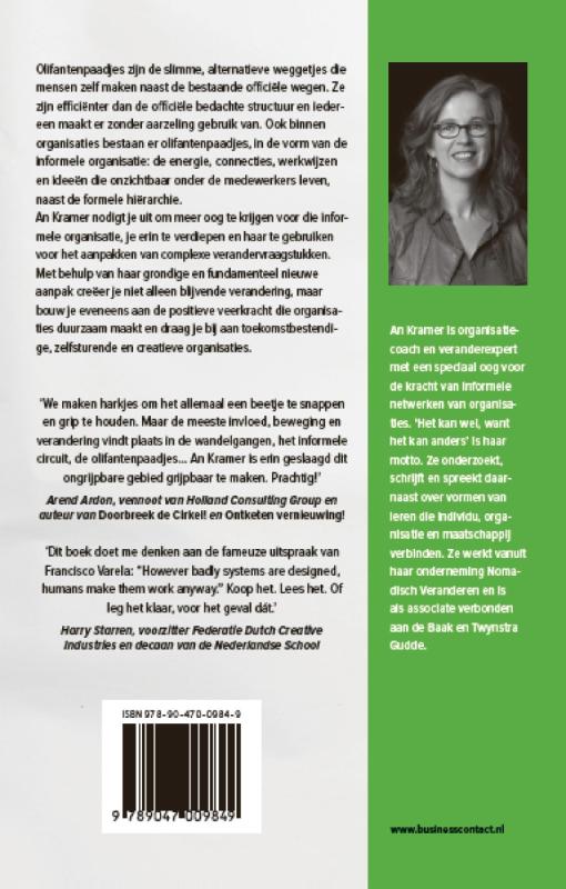 Olifantenpaadjes zijn de slimme, alternatieve weggetjes die mensen zelf maken naast de bestaande officiële wegen. Ze zijn efficiënter dan de officiële bedachte structuur en iedereen maakt er zonder aarzeling gebruik van. An Kramer laat zien dat er ook binnen organisaties olifantenpaadjes bestaan, in de vorm van de informele organisatie: de energie, connecties, werkwijzen en ideeën die onzichtbaar onder de medewerkers leven, naast de formele hiërarchie.