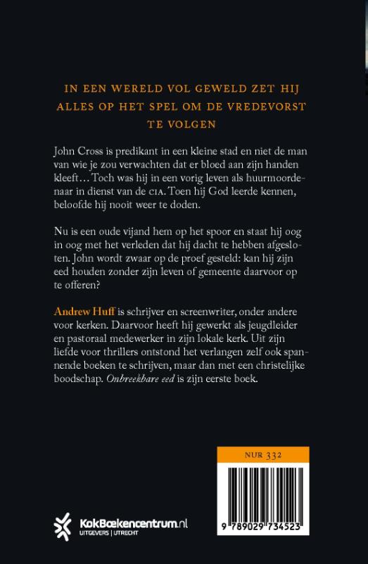 In ‘Onbreekbare eed’ van Andrew Huff leidt predikant John Cross zijn gemeente op het goede pad. Hij is niet iemand van wie je verwacht dat hij een duister verleden heeft, maar de waarheid is dat hij in een vorig leven in dienst was van de CIA. Toen John zich bekeerde tot God, heeft hij zijn oude leven achter zich gelaten, maar nu is een oude vijand hem op het spoor die hem voor zijn zonden wil laten betalen met zijn leven. Kan John zich aan zijn eed houden en het probleem oplossen zonder dat er bloed wordt vergoten? Kan hij zijn gemeente en zichzelf beschermen? Als het erop aankomt, is zijn leven misschien wel het enige wat hij nog heeft om op te offeren…