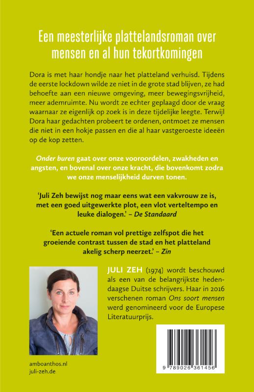 In Onder buren van Juli Zeh is Dora met haar hondje naar het platteland verhuisd. Naar een klein dorp in het niemandsland van Brandenberg. Tijdens de lockdown wilde ze niet in de grote stad blijven. Ze had behoefte aan een nieuwe omgeving, meer bewegingsvrijheid, meer ademruimte. Nu wordt ze geplaagd door de vraag waarnaar ze eigenlijk op zoek is in deze tijdelijke leegte. Is het afstand van haar vriend Robert, die met zijn activisme steeds verder van haar af komt te staan? Of hoopt ze erachter te komen waarom de wereld zo verwarrend is geworden?