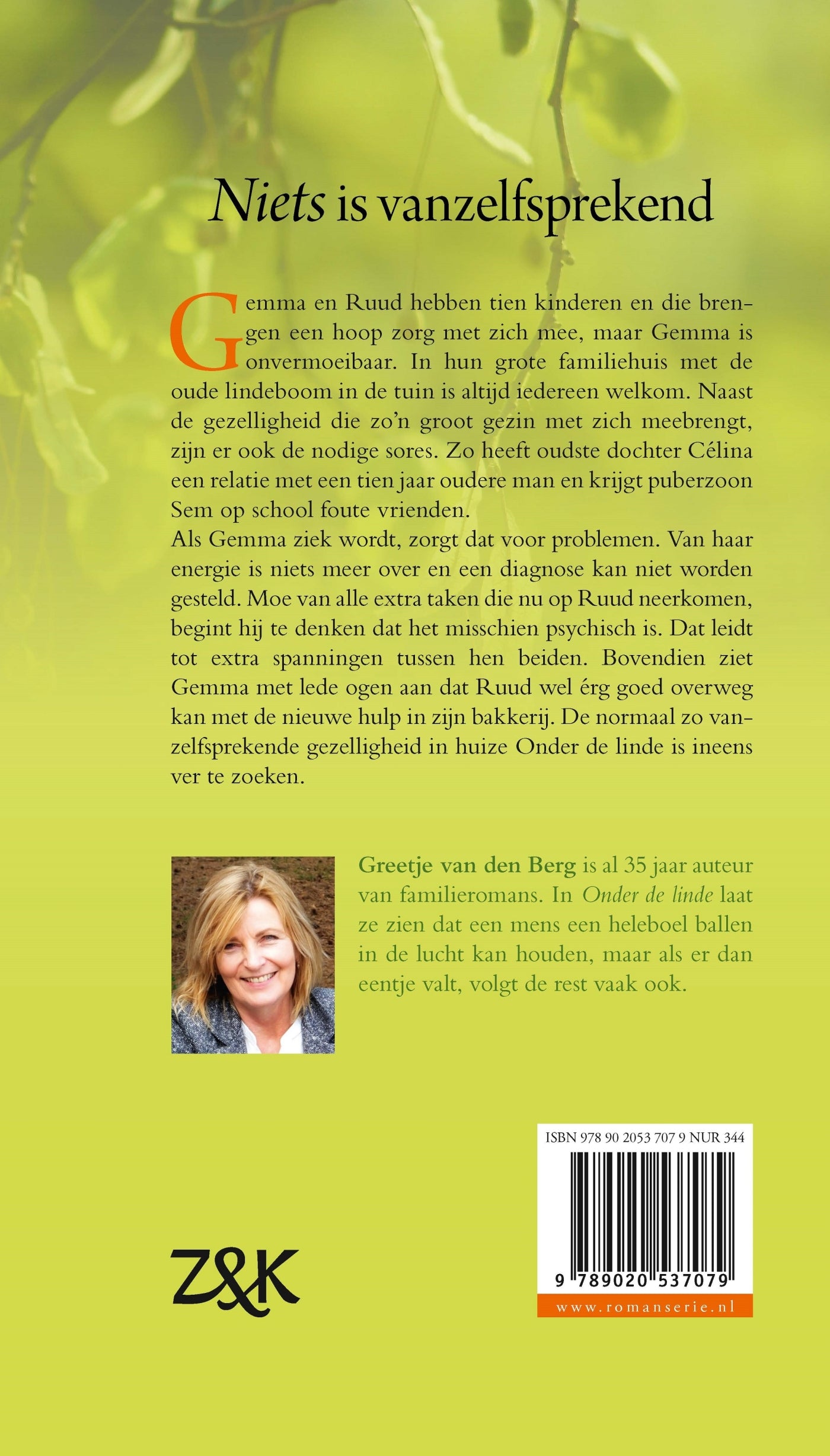 'Onder de linde' van Greetje van den Berg gaat over Gemma, die samen met haar man Ruud tien kinderen heeft. Ze wonen in een groot, oud huis dat ooit van zijn ouders was, Onder de Linde – een verwijzing naar de grote lindeboom in de tuin. Gemma is een onvermoeibare moeder en in het grote familiehuis is altijd iedereen welkom. Haar standpunt is dat elk probleem er is om opgelost te worden. Maar als ze dan ziek wordt en er geen diagnose kan worden gesteld, begint ze aan haar eigen overtuiging te twijfelen. Ruud denkt dat het misschien psychisch is en dat zorgt voor een verwijdering tussen hen beiden. Bovendien ziet Gemma met lede ogen aan dat Ruud wel erg goed overweg kan met de nieuwe hulp in zijn bakkerij. In Huize Onder de Linde is de normaal zo vanzelfsprekende gezelligheid ver te zoeken, en dan lijkt het er ook nog op dat de lindeboom ziek is en moet worden omgehakt. Greetje van den Berg schrijft in 'Onder de linde' met veel gevoel en inlevingsvermogen over tanend vertrouwen, maar ook over hoop en toekomst.