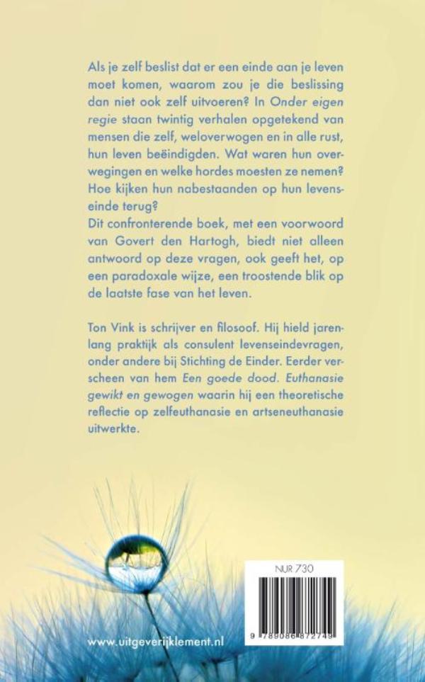 In Onder eigen regie vertelt Ton Vink ons de persoonlijke verhalen van mensen die voor zelfeuthanasie kozen. Vink begeleidde jarenlang een groot aantal mensen bij het maken van die onomkeerbare keuze. [ Aangrijpend tekent Vink de ervaringen op van Johan, mevrouw Petersen, Hans en vele anderen die hun leven als voltooid zagen. ]