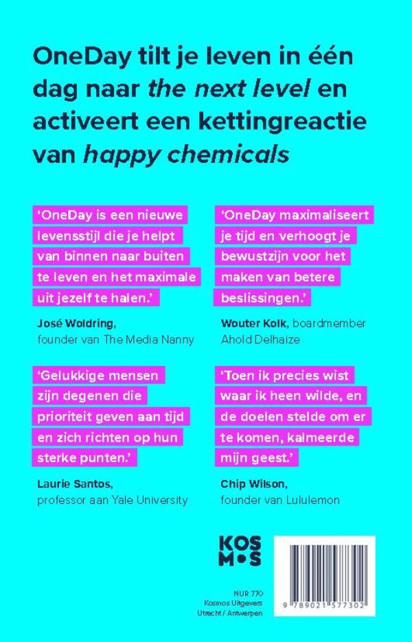 ‘One Day’ geeft je het inzicht én de tools om het maximale uit jouw kostbare dagen, jezelf en je leven te halen. Dit door de uren in je dag te verdubbelen, terwijl je de hoogste staat van voldoening ervaart. Als de tijd steeds sneller gaat, onderneem dan nu actie!