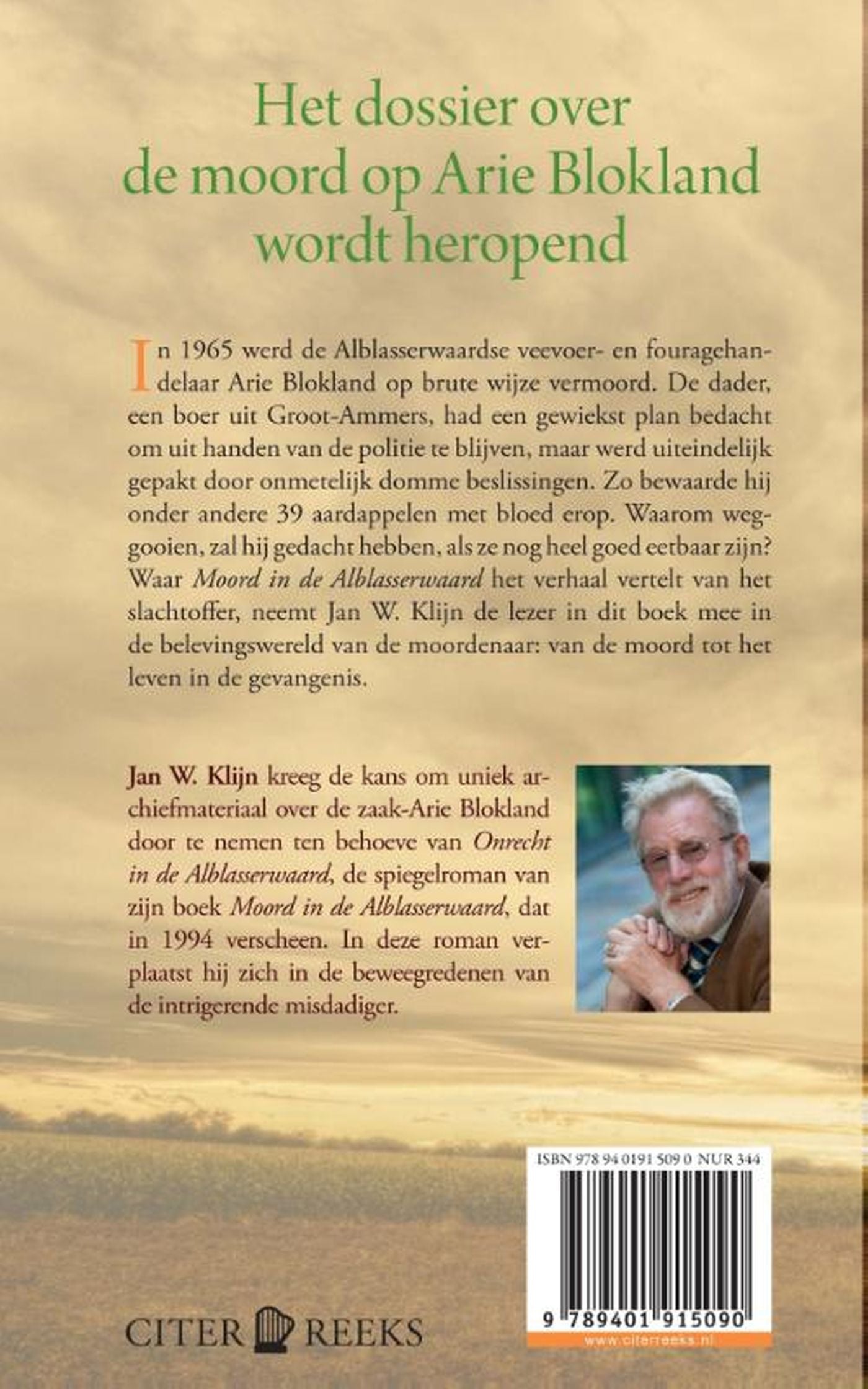 ‘Onrecht in de Alblasserwaard’ is de spiegelroman van ‘Moord in de Alblasserwaard’ van Jan W. Klijn. ‘Onrecht in de Alblasserwaard’ gaat over de dader van de roofmoord op Arie Blokland, een Alblasserwaardse veevoerhandelaar. Deze dader, een boer uit Groot-Ammers, werd gepakt doordat hij onder andere zo stom was om 39 aardappelen te bewaren met bloed erop. Waarom weggooien, zal hij gedacht hebben, als ze nog heel goed eetbaar zijn? Deze roman van Jan. W. Klijn beschrijft het verhaal van een moordenaar die even gewiekst is als soms onmetelijk dom. Een roman gebaseerd op ware gebeurtenissen.
