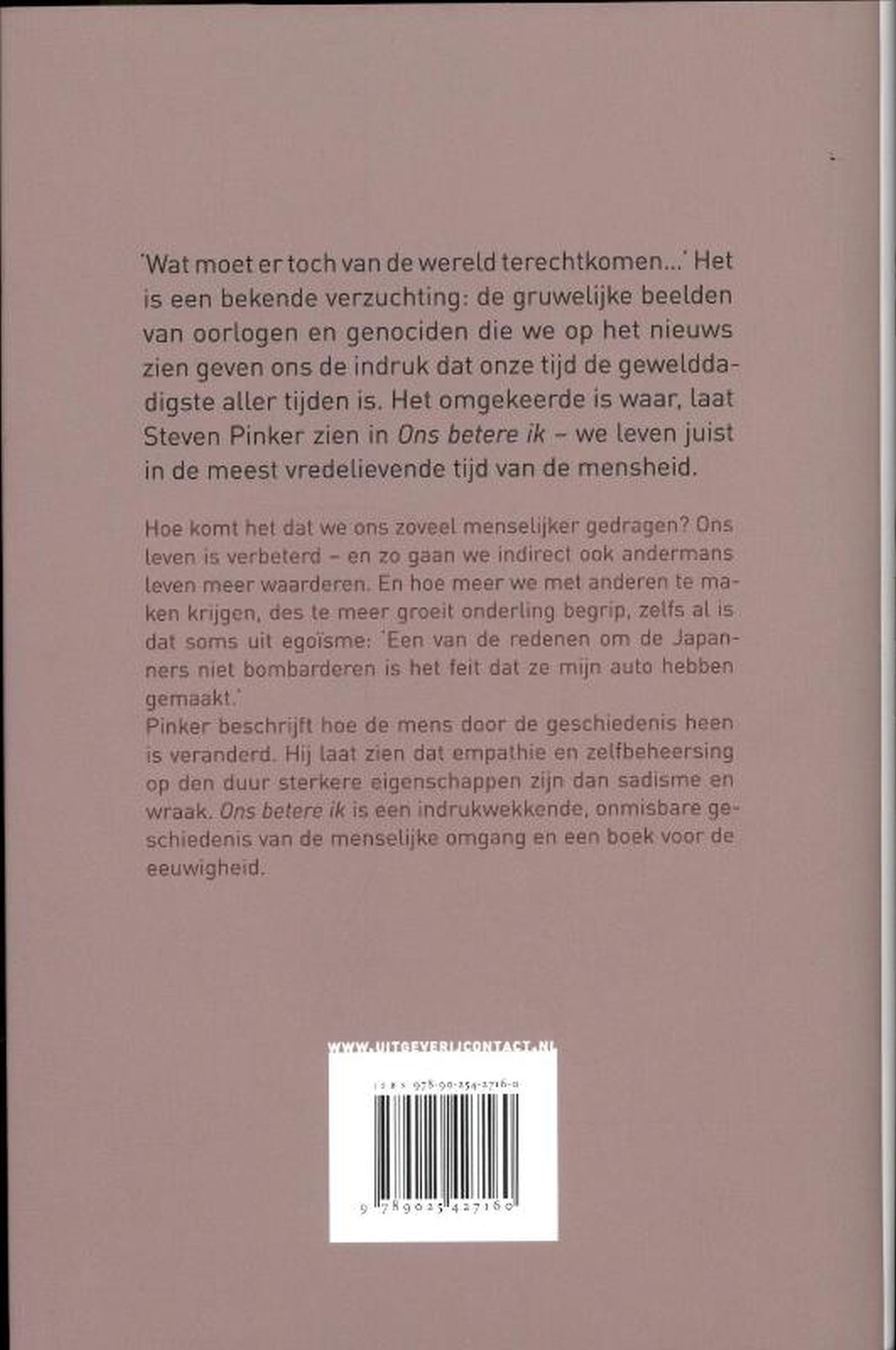 Hoe komt het dat we ons zoveel menselijker gedragen? Ons leven is verbeterd - en zo gaan we indirect andermans leven meer waarderen. En hoe meer we met anderen te maken krijgen, des te meer groeit onderling begrip, zelfs al is dat soms uit egoïsme. Pinker laat zien dat empathie en zelfbeheersing op den duur sterkere eigenschappen zijn dan sadisme en wraak. Ons beter ik is een indrukwekkende, onmisbare geschiedenis van de menselijke omgang en een boek voor de eeuwigheid.