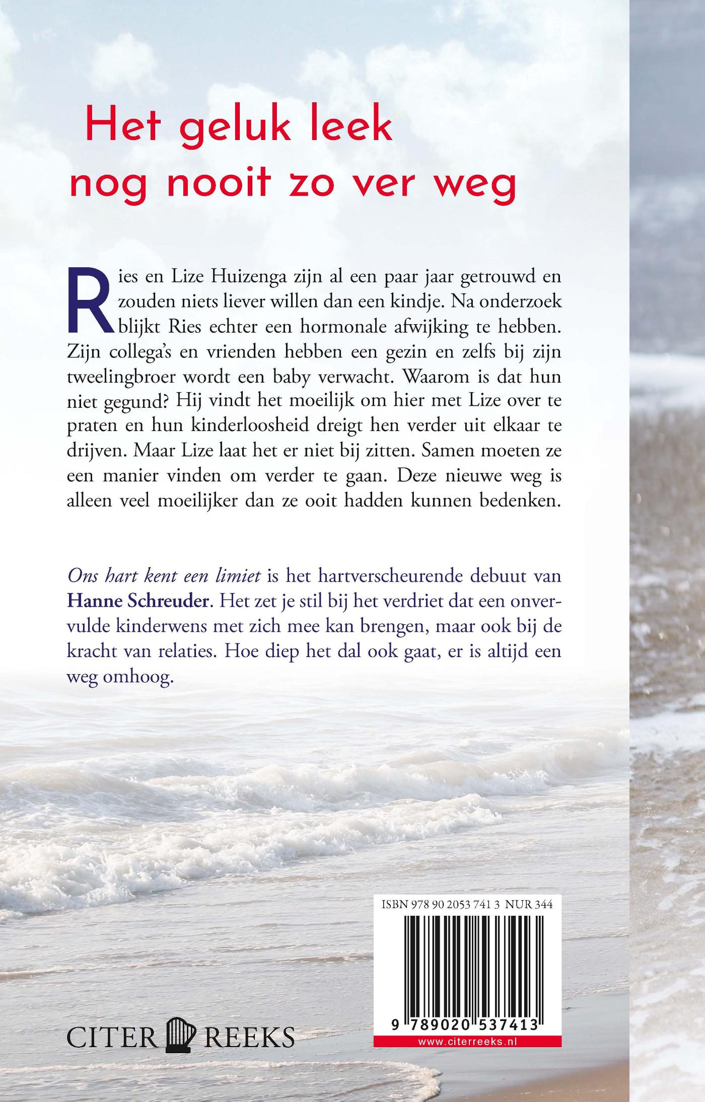 'Ons hart kent een limiet' is het debuut van Hanne Schreuder. Een roman op christelijke grondslag over ongewenste kinderloosheid. Wanneer Ries en Lize Huizenga een paar jaar getrouwd zijn, zouden ze graag kinderen willen. Ries heeft echter een hormonale afwijking, waardoor dit niet lukt. Hij vindt het moeilijk om hier met Lize over te praten en hun kinderloosheid dreigt hen verder uit elkaar te drijven. Lize laat het er niet bij zitten. Ze blijft toenadering zoeken. Langzaam maar zeker leert Ries om haar in vertrouwen te nemen over zijn gedachten en gevoelens. Samen vinden ze een manier om verder te gaan. Deze nieuwe weg is alleen veel moeilijker dan ze ooit hadden kunnen bedenken. Hanne Schreuder brengt met 'Ons hart kent een limiet' een hartverscheurende roman over verlangen en verlies. Het zet je stil bij het verdriet dat een onvervulde kinderwens met zich mee kan brengen, maar ook bij de kracht van relaties. Hoe diep het dal ook gaat, er is altijd een weg omhoog.