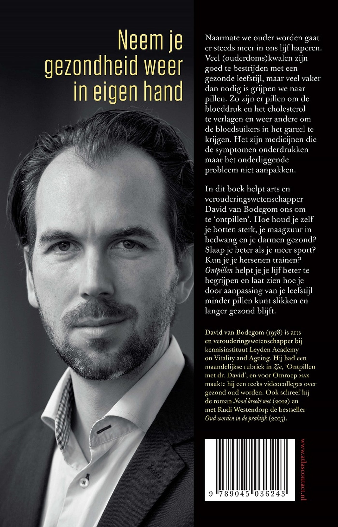 In ‘Ontpillen’ helpt arts en verouderingswetenschapper David van Bodegom ons om gezonder te leven en minder pillen te gebruiken. Naarmate we ouder worden gaat er steeds meer in ons lijf haperen. Veel (ouderdoms)kwalen zijn goed te bestrijden met een gezonde leefstijl, maar veel vaker dan nodig is grijpen we naar pillen. Zo zijn er pillen om de bloeddruk en het cholesterol te verlagen en weer andere om de bloedsuikers in het gareel te krijgen. Het zijn medicijnen die de symptomen onderdrukken, maar het onderliggende probleem niet aanpakken.