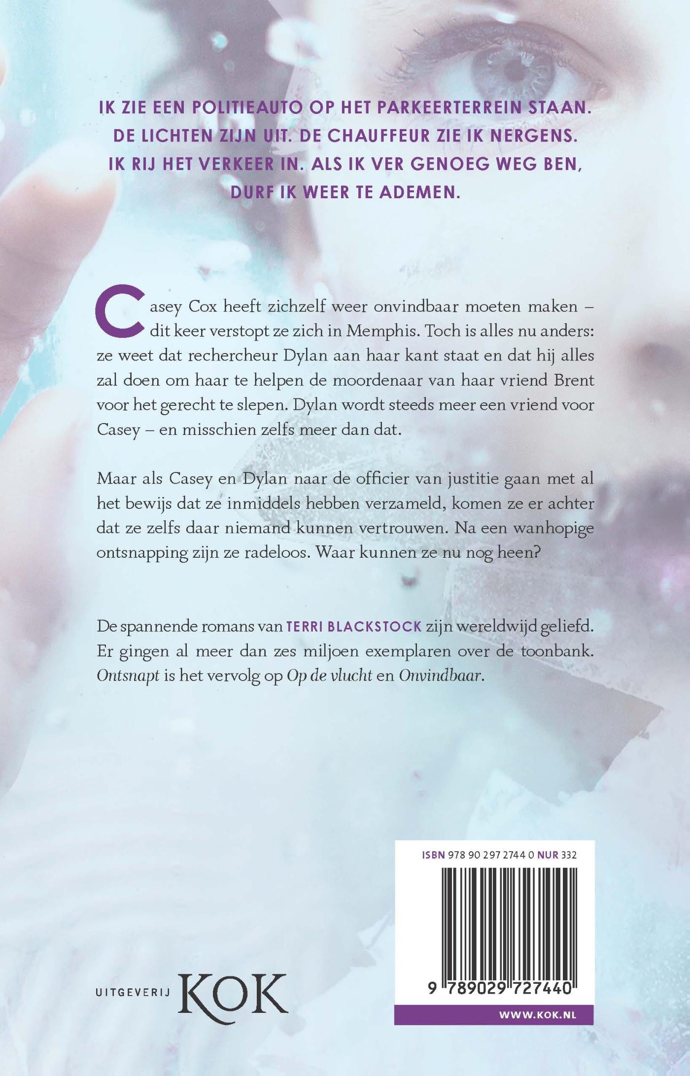 Nadat Terri Blackstock de lezer na ‘Onvindbaar’ in spanning achterliet, vinden we Casey in ‘Ontsnapt’ terug in Memphis. Met rechercheur Dylan aan haar zijde, spant ze zich tot het uiterste in om de moordenaar van haar vriend Brent voor het gerecht te slepen. Als Casey en Dylan met hun bewijs naar de officier van justitie gaan, komen ze er achter dat ze zelfs bij justitie niemand kunnen vertrouwen. Na een wanhopige ontsnapping zijn ze radeloos: tot wie kunnen ze zich nu nog richten?