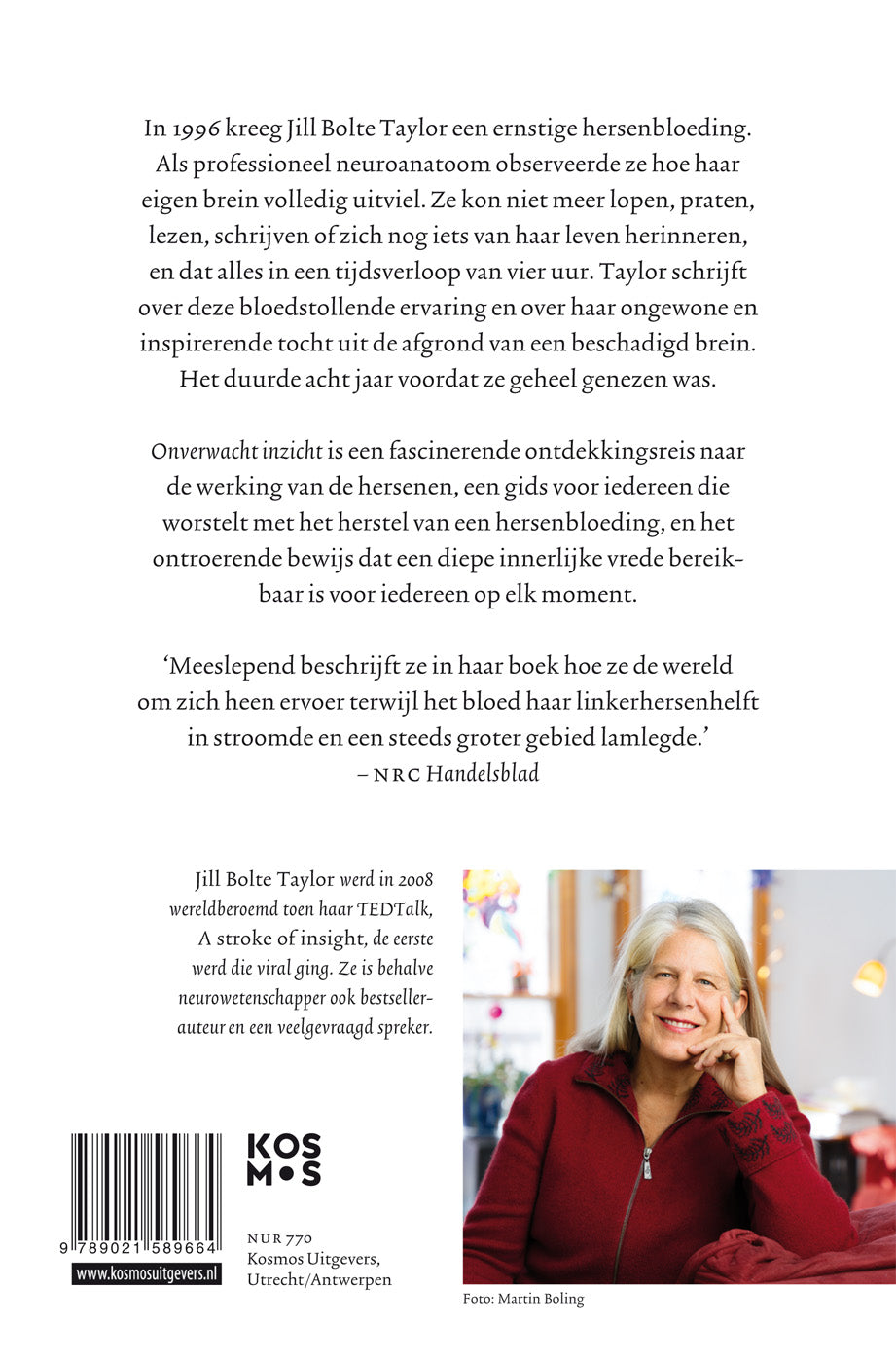 In 1996 kreeg Jill Bolte Taylor een ernstige hersenbloeding. Ze kon niet meer lopen, praten, lezen, schrijven of zich nog iets van haar leven vóór dit moment herinneren. Als hersenwetenschapper kreeg ze de unieke kans om te observeren hoe haar brein op deze beschadiging reageerde: hoe gevoelens van euforie en vrede zich afwisselden met professionele belangstelling en het rationele besef dat ze hulp moest zoeken voordat het te laat zou zijn. Haar herstel zou acht jaar duren. In Onverwacht inzicht schrijft Taylor over het inzicht dat ze verkreeg dankzij haar ongewone en inspirerende tocht uit de afgrond van een beschadigd brein. Haar verslag biedt een unieke blik op het menselijk brein en zijn herstellend vermogen.